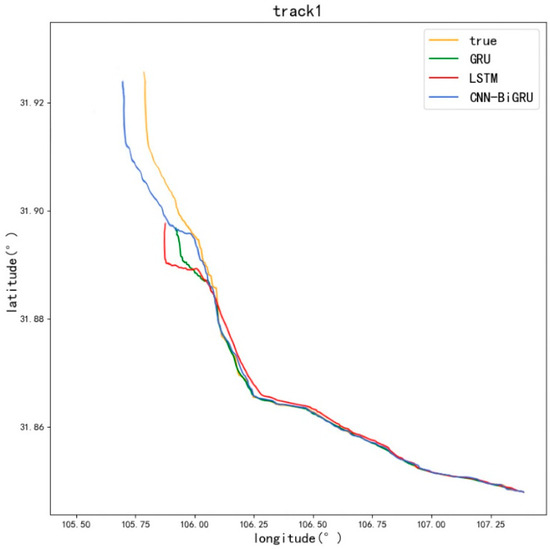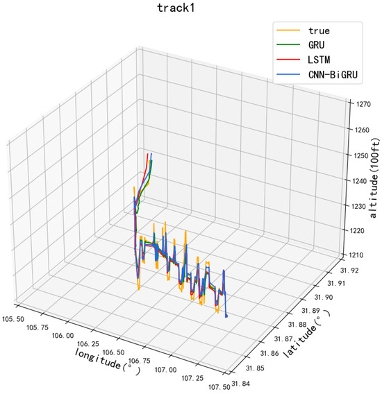 In order to verify the accuracy of the prediction, we compare the output of LSTM, GRU, and other comparison models with the actual trajectory. Figure 8 is the two-dimensional latitude and longitude comparison diagram of the predicted trajectory and the actual trajectory of each model. Figure 9 is a three-dimensional trajectory comparison diagram containing height information, which intuitively shows the prediction performance of the model in space.