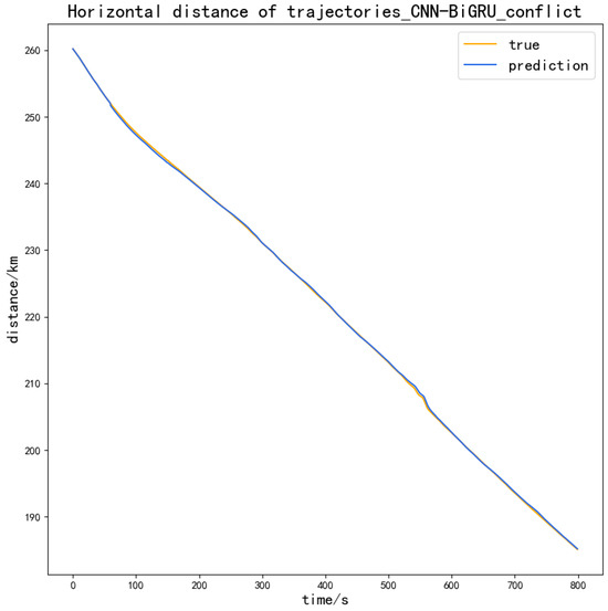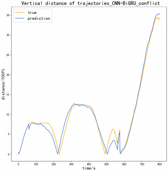 In order to evaluate the effectiveness of the model in security applications, Figure 10 and Figure 11 compare the vertical and horizontal intervals between the predicted trajectory and the actual trajectory. The high overlap of the two curves shows that the model can effectively simulate the real distance change between aircraft. Finally, the preset conflict detection method is used for verification. The prediction results show that the two aircraft can maintain a safe interval during the whole flight in the next 800 s, and successfully pass the verification of safe operation in the terminal area.