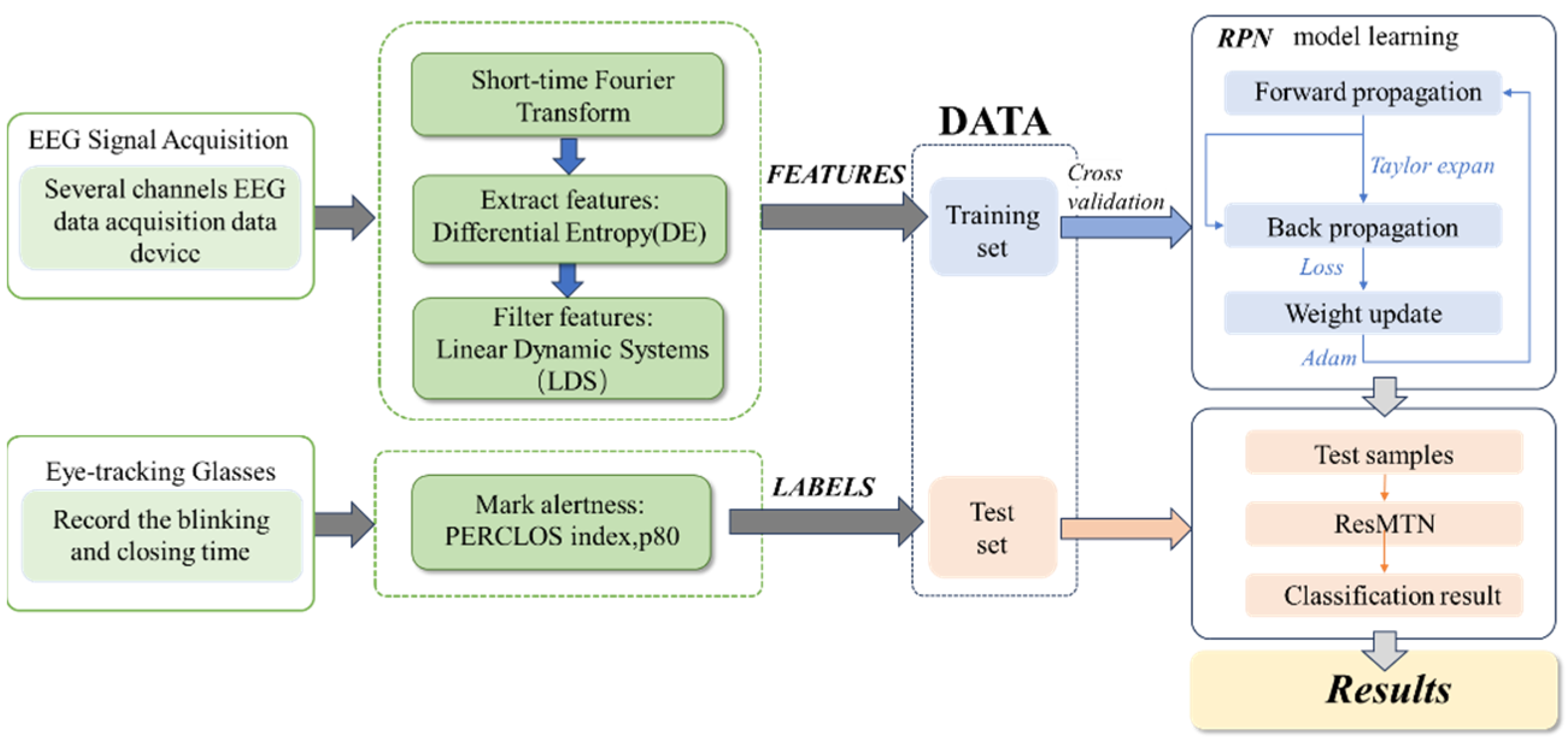 This yields the time-varying spectrum of the signals, from which differential entropy features are extracted. These features are then filtered using LDS to obtain the final feature values, which serve as inputs to the RPN classification model. Additionally, the PERCLOS p80 standard is used as the label. Given the training set, the RPN fatigue classification model is first trained and then tested on the test set.
