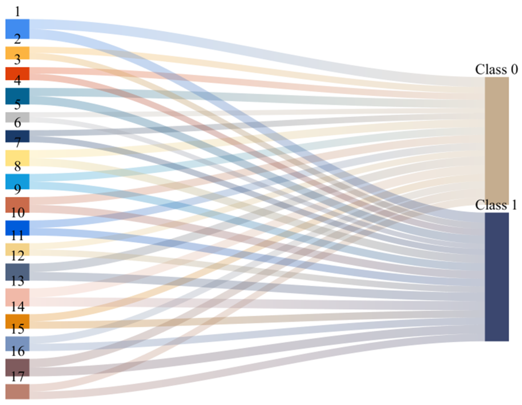 In the Sankey diagram, features with wider flow bands indicate greater contributions to the model’s decision-making. The diagram visually illustrates the relationships between 17 input features and the two classification outcomes (0: alert, 1: fatigued), as shown in