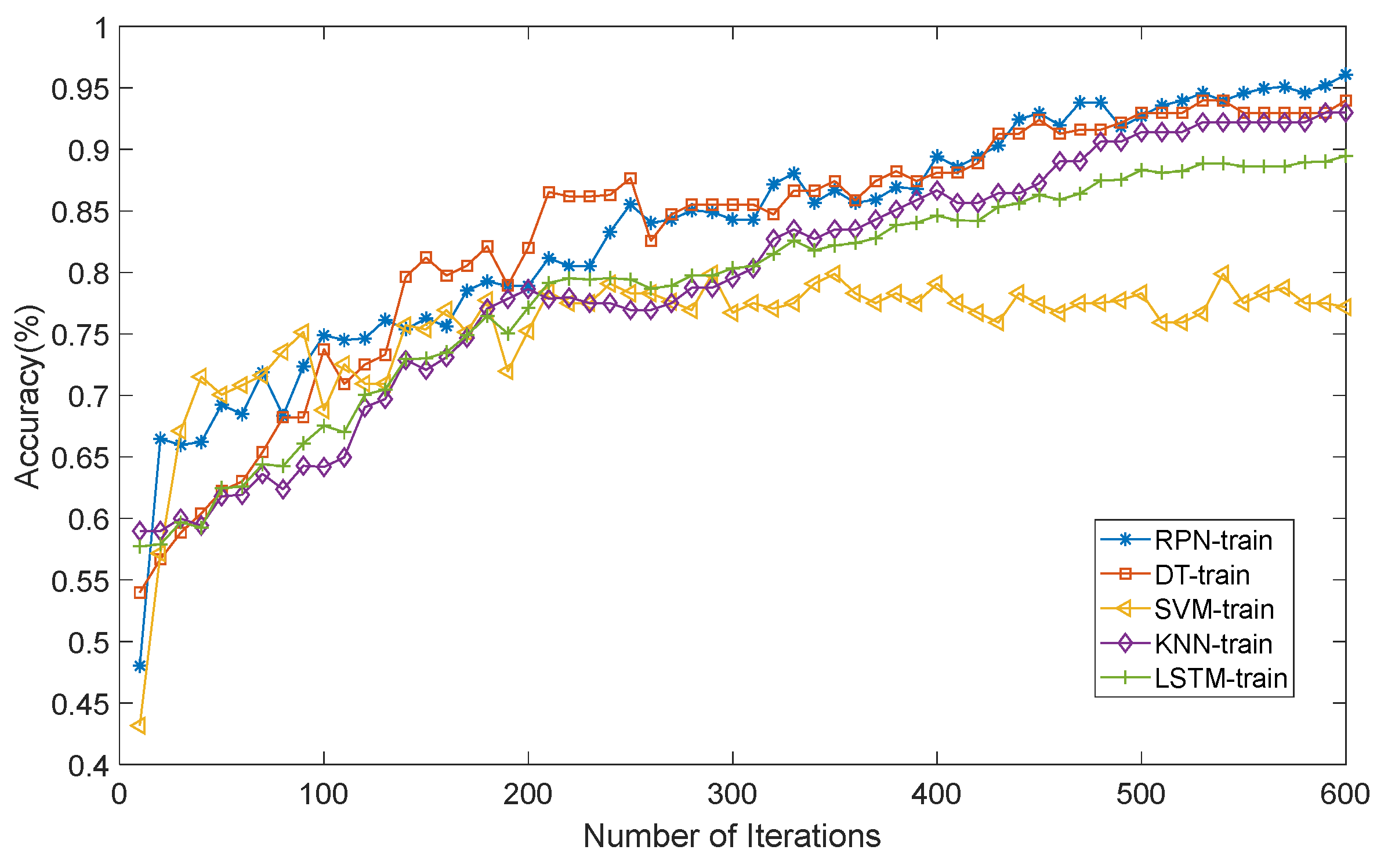 In this experiment, the proposed RPN classifier is compared with SVM, KNN, DT, LSTM, Graph-based MI-MBFT [