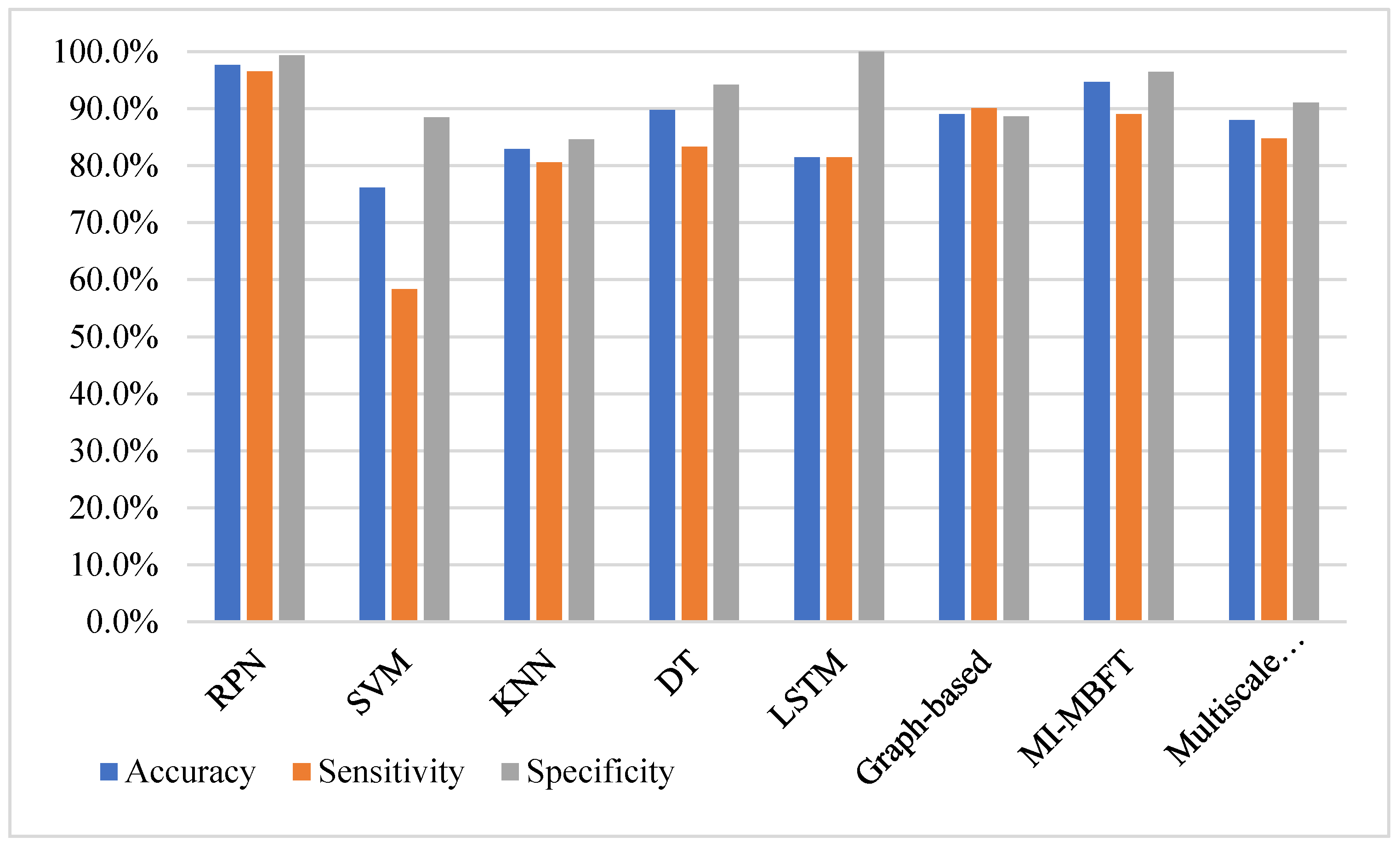 To more intuitively demonstrate the performance differences among the models, we compared the accuracy, sensitivity, and specificity of RPN, SVM, KNN, DT, LSTM, Graph-based MI-MBFT and Multiscale Convolutional Transformer models using bar charts in