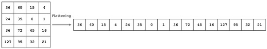- Flatten Layer. This layer flattens the input. If the input is a matrix of size , the flatten layer will convert it into a vector of 16 elements, as illustrated in Figure 4.