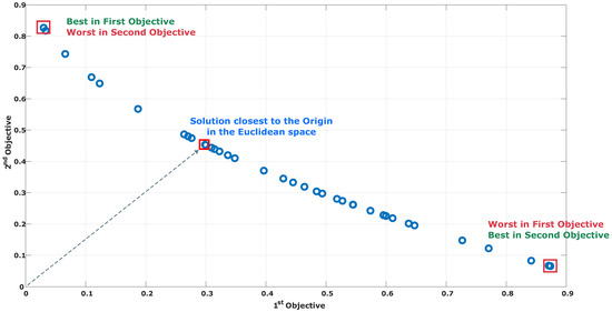 An inherent trait in multi-objective optimization strategies is the generation of diverse solutions involving a trade-off among the objectives. The solution marked in a red square in the upper-left position of Figure 5 achieves the minimum value for the first objective with a high cost in the second one. In contrast, the solution marked in the red square at the bottom-right achieves the worst and best cost for the first and second objective, respectively. As a consequence, the solution that has the closest distance to the origin, in terms of the Euclidean definition, was found near the center of all the solution sets, which have equilibrated fitness values for the two involved objectives. The main strategy of the MOEA-D to solve multi-objective problems is the decomposition process, which decomposes the problem into a set of interconnected single-objective scalarized subproblems. The problem decomposition starts by defining a number N of weight vectors defined as follows: