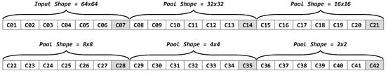 By considering distinct pooling sizes (, , , , and ), the previous structure can be repeated 6 times to form the full representation of the CNN architecture as a vector of 42 elements, as illustrated in Figure 7.