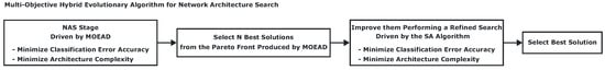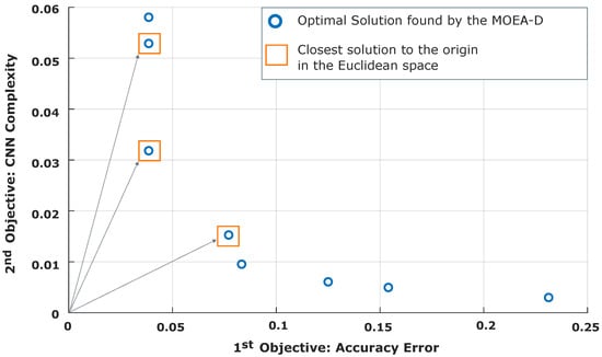 According to Figure 8, the hybrid metaheuristic starts with an initial CNN architecture search driven by the MOEA-D method, which returns a set of trade-off solutions known as the Pareto front. In step 2, a subset of N solutions is selected from the Pareto front to be improved. For this paper, we selected 3 solutions closest to the origin in terms of the Euclidean distance. In step 3, the SA algorithm is used to improve the previously selected solutions.