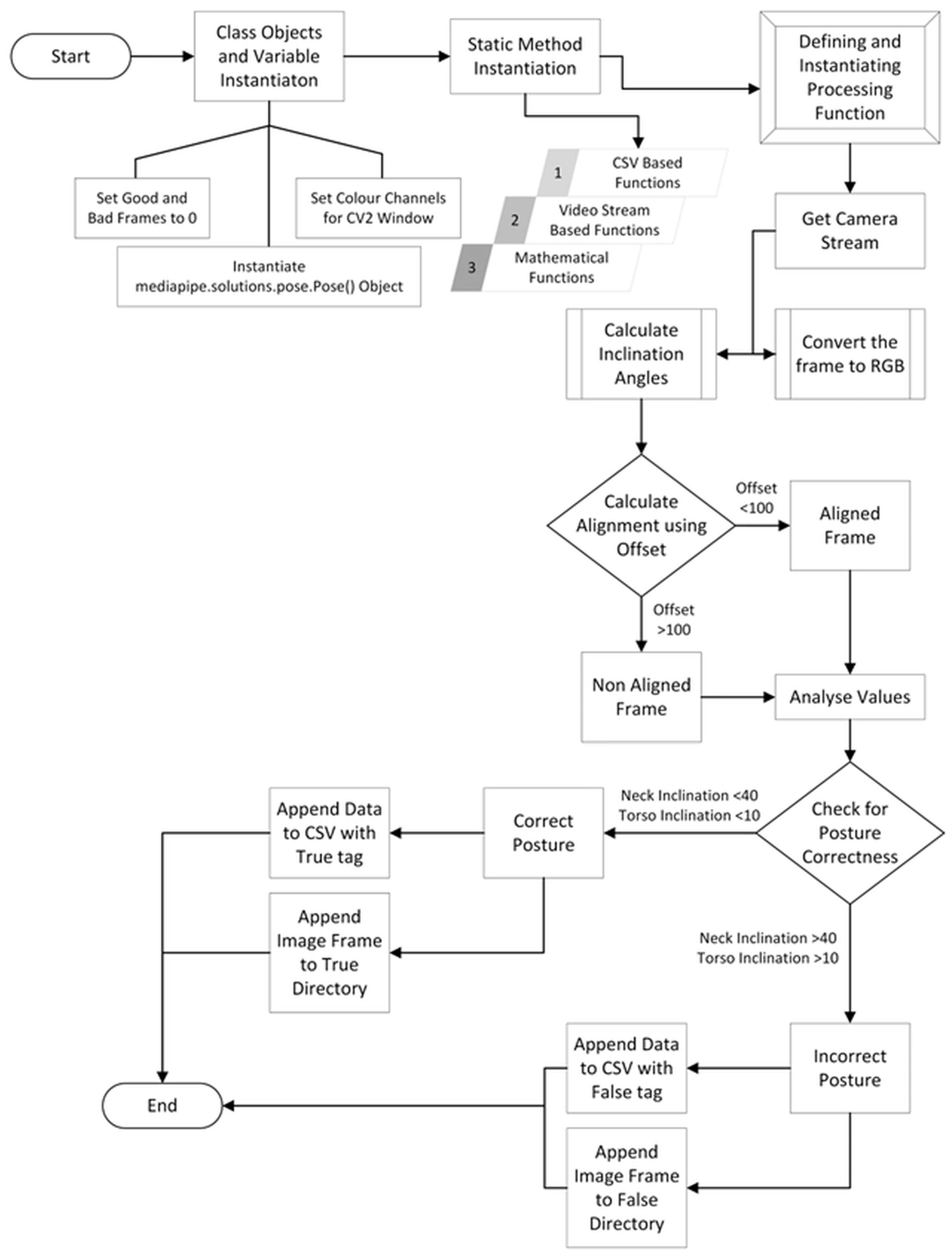 The objective of the proposed framework is to enable real-time classification of sitting posture using visual input. The system operates on a continuous RGB video stream captured from a side-view camera. Each incoming video frame is processed to extract pose landmarks through computer vision-based pose estimation. From these landmarks, geometric descriptors—namely horizontal offset, neck inclination, and torso inclination—are computed to quantitatively characterize upper-body posture. These descriptors are represented as numerical feature vectors and are used to train classical machine learning models, while the corresponding RGB frames are retained to construct an image-based dataset for deep learning models. The output of the framework is a binary classification decision for each processed frame, indicating whether the observed sitting posture is classified as correct or incorrect. Formally, the posture detection task addressed in this work is defined as a binary classification problem that maps each incoming RGB video frame to a posture label (True for correct posture, False for incorrect posture), while higher-level feedback is generated only when the False label persists across a predefined number of consecutive frames.