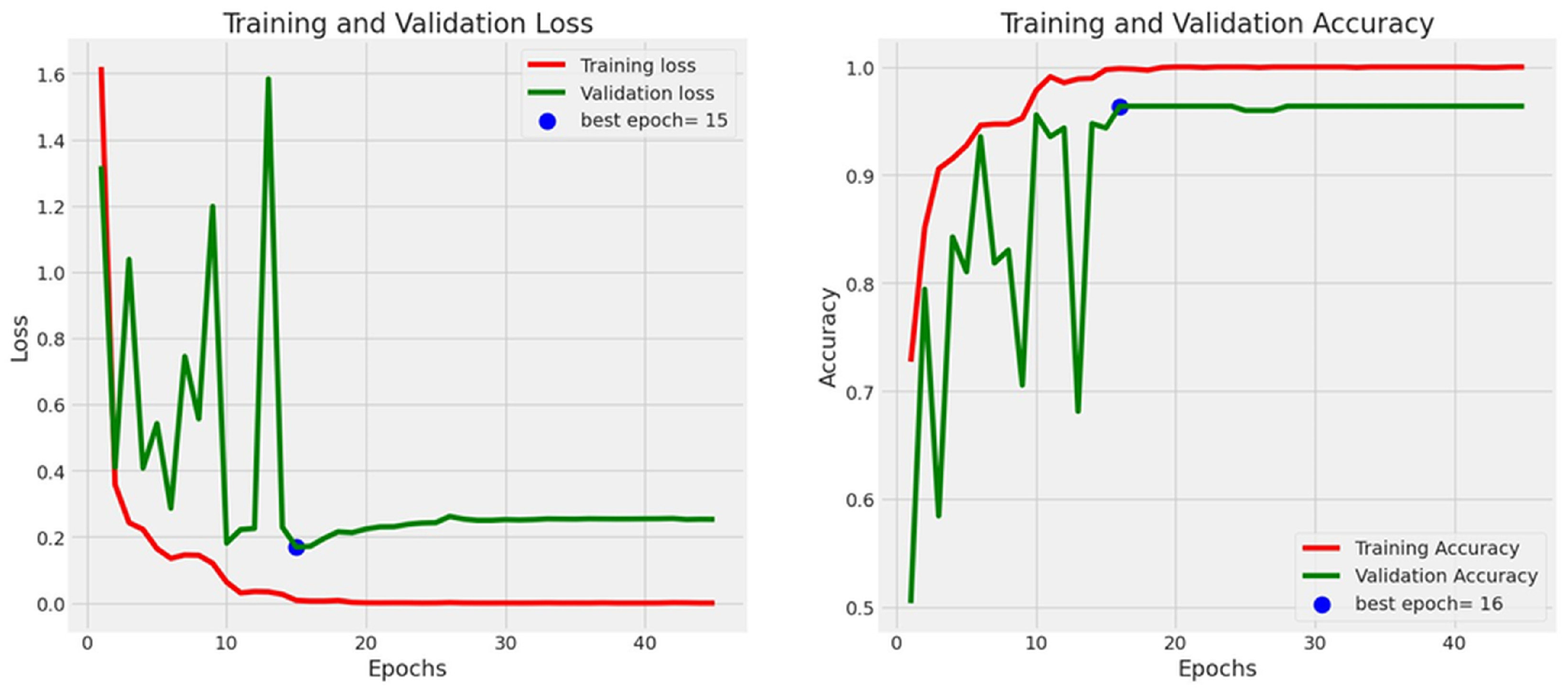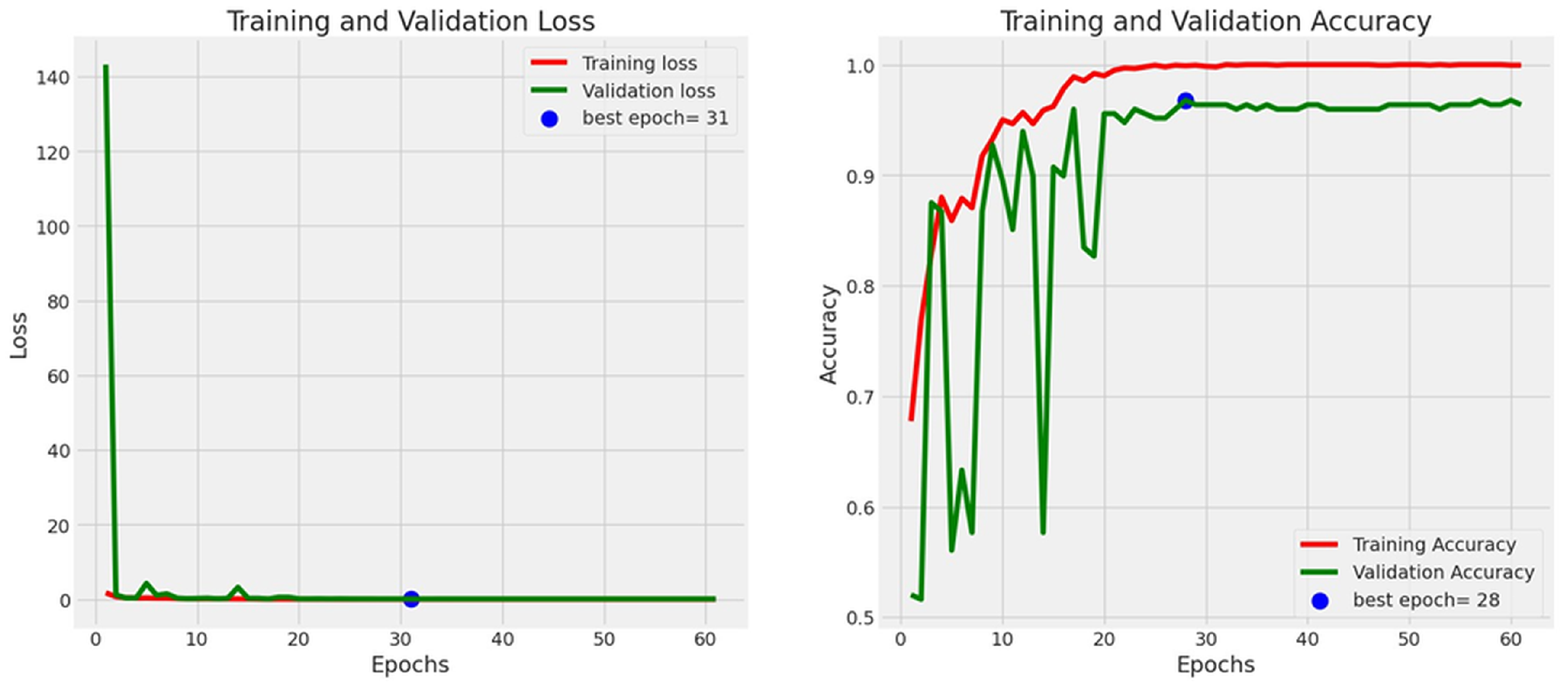 Figure 6 shows that ResNet52 converges smoothly: training accuracy rises steadily and the validation curve follows closely, with both stabilizing near the early-stopping point (epoch 88). The absence of large oscillations and the small, persistent gap between training and validation trajectories indicate stable optimization and limited overfitting. This behavior aligns with the residual architecture’s facilitation of gradient flow, supporting the strong generalization observed in