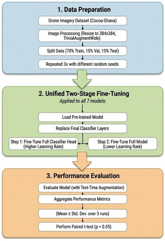 To ensure a fair comparison, all seven selected models were trained using an identical, state-of-the-art training pipeline. This framework was designed to maximize robustness and generalization. To provide a comprehensive overview of the proposed approach, Figure 3 illustrates the unified experimental design, detailing the workflow from data preparation and the two-stage fine-tuning strategy to the final statistical evaluation.
