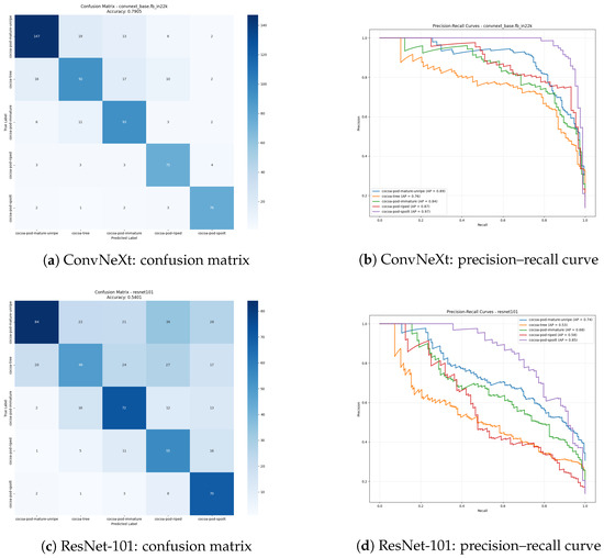 As illustrated in Figure 4, the model demonstrates a balanced performance across all classes. Crucially, the confusion matrix (Figure 4a) shows minimal confusion between the most economically significant classes, ‘cocoa-pod-riped’ and ‘cocoa-pod-spoilt’. The precision–recall curves (Figure 4b) confirm this robustness, with the model maintaining high precision scores even at higher recall thresholds. This indicates that the unified two-stage training strategy successfully imparts fine-grained discriminative features to the modern architecture.