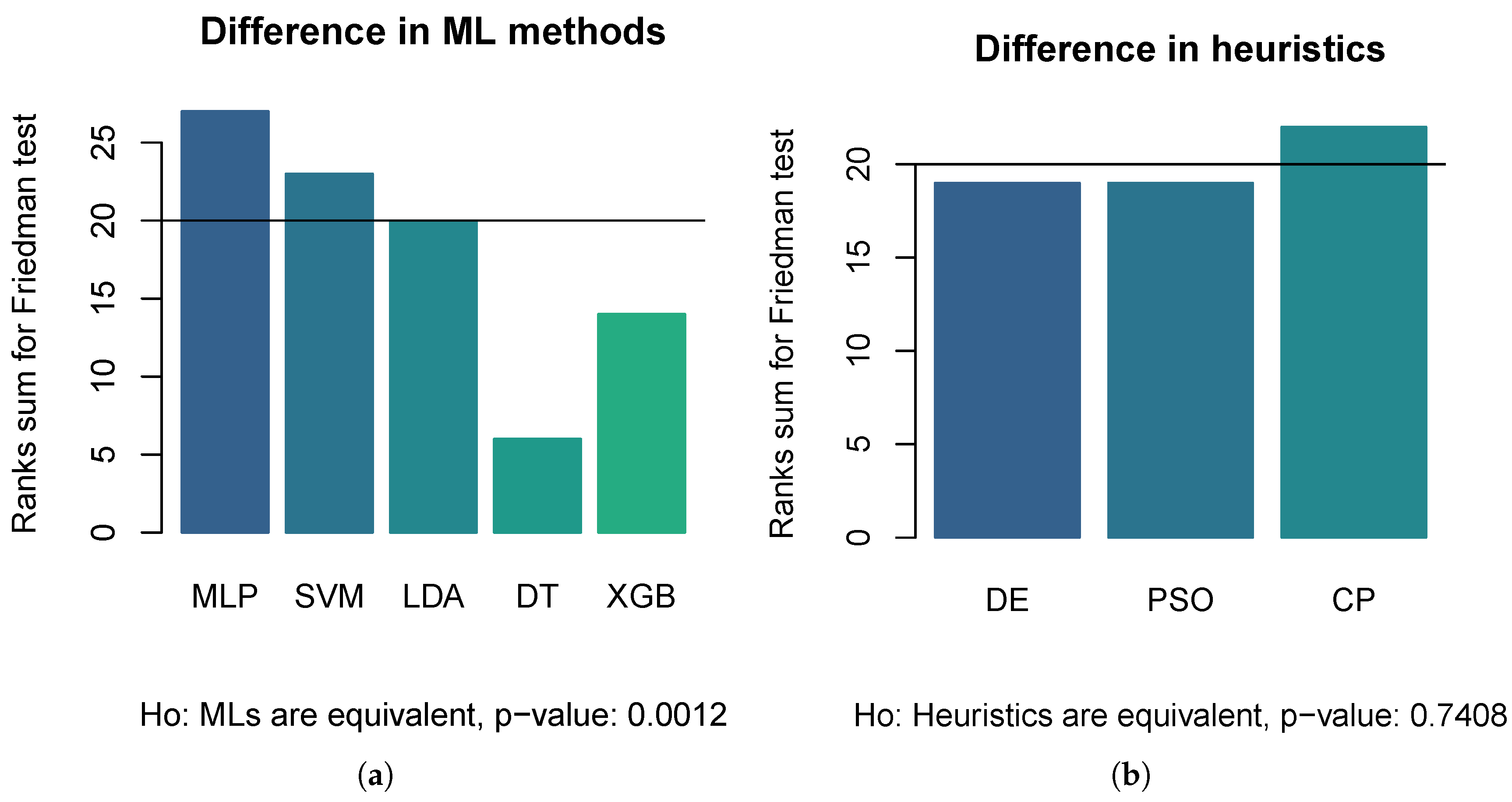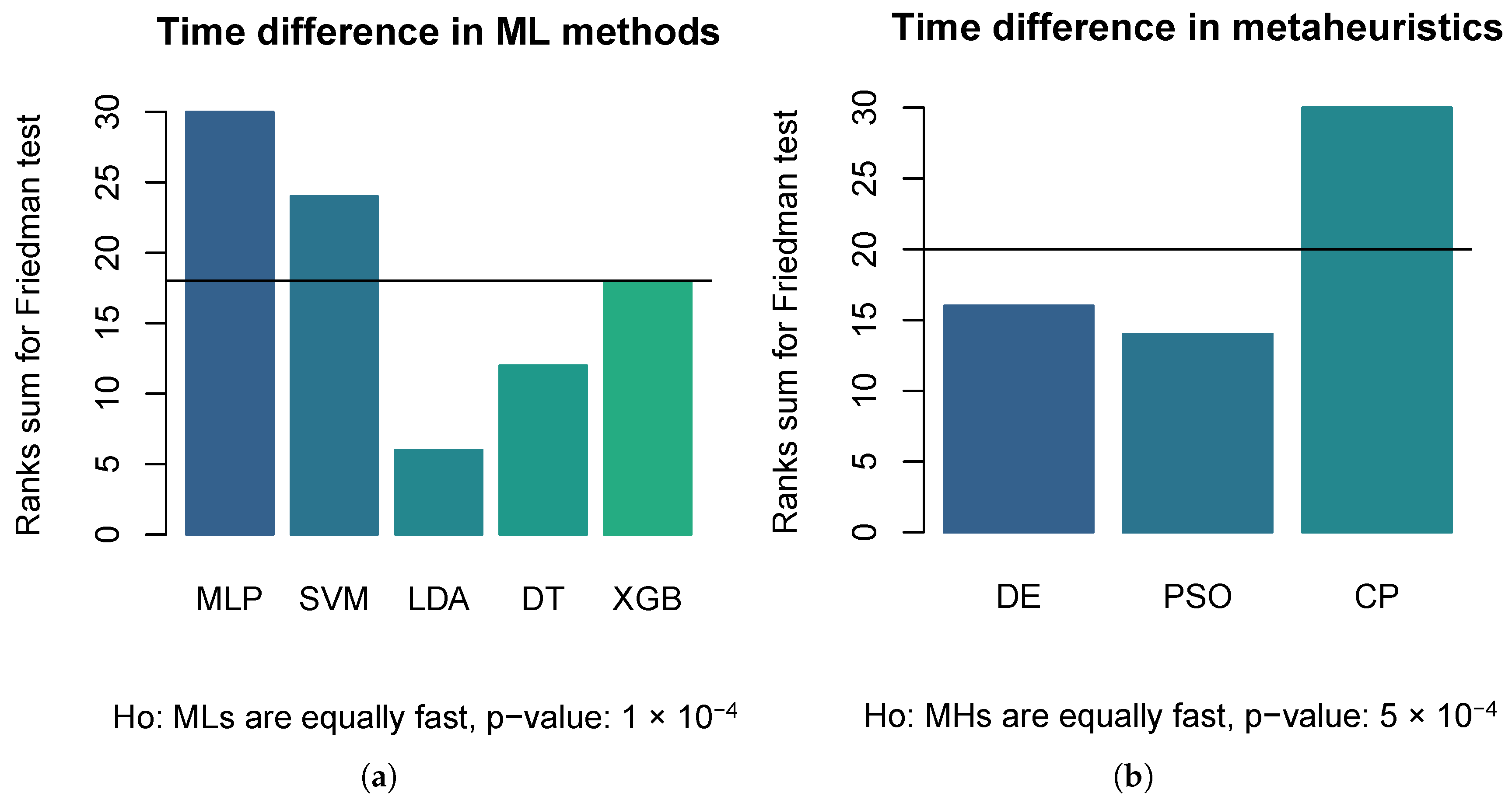 Figure 4 illustrates Friedman tests for contrasting optimizing–training time between (a) machine learning methods and (b) metaheuristics. In both cases, the hypothesis of equality is rejected: (a) MLP and SVM are significantly slower, and (b) CP is significantly slower than DE and PSO. Although metaheuristics perform approximately the same number of function evaluations 1