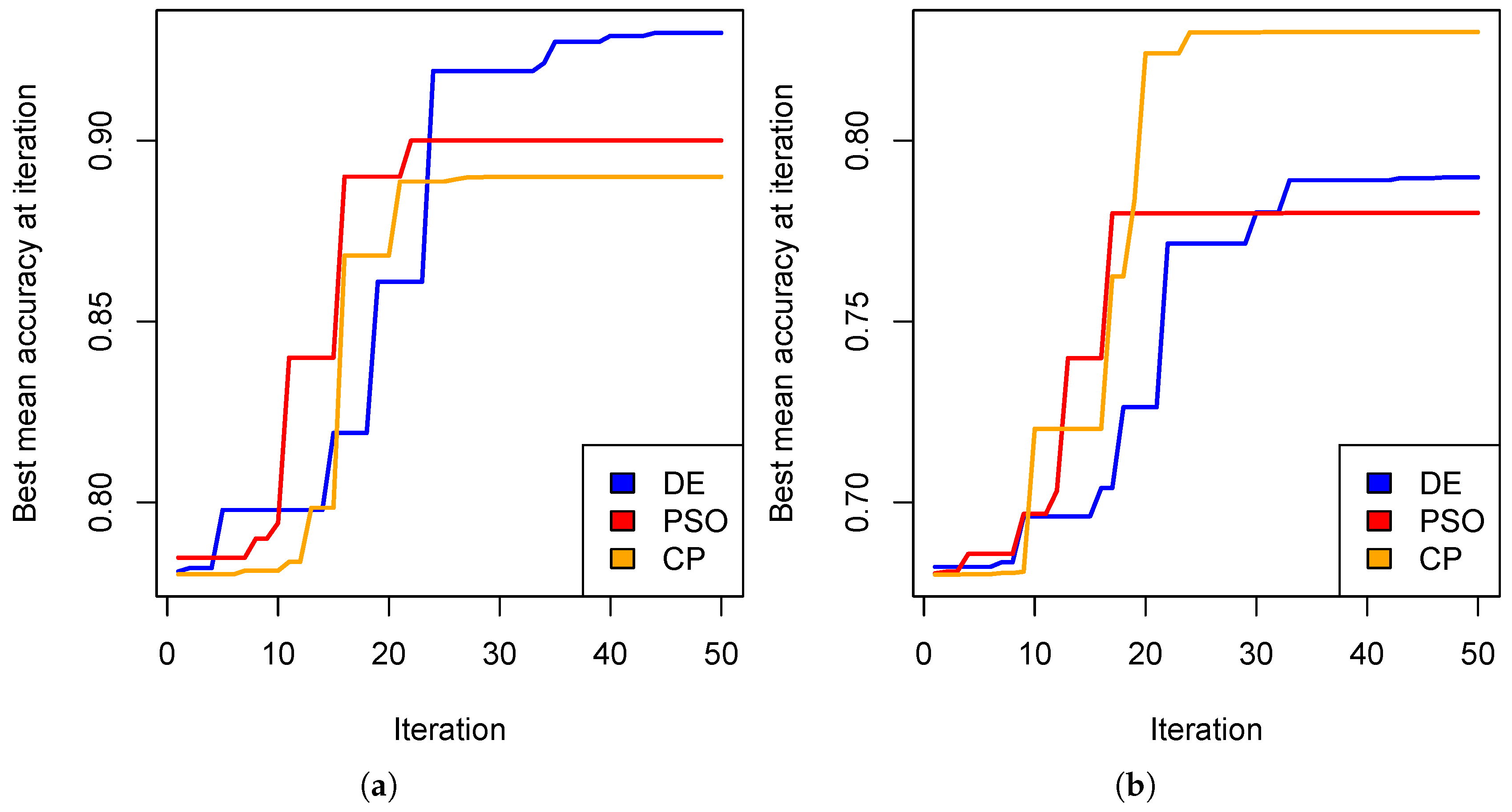 Figure 5 shows how the mean accuracy converges for MLP and SVM during the execution of the three tested metaheuristics. These convergence charts visually exhibit the superiority of combinations MLP+DE and SVM+CP. In all cases, the metaheuristic search stops when the trend gets stuck.