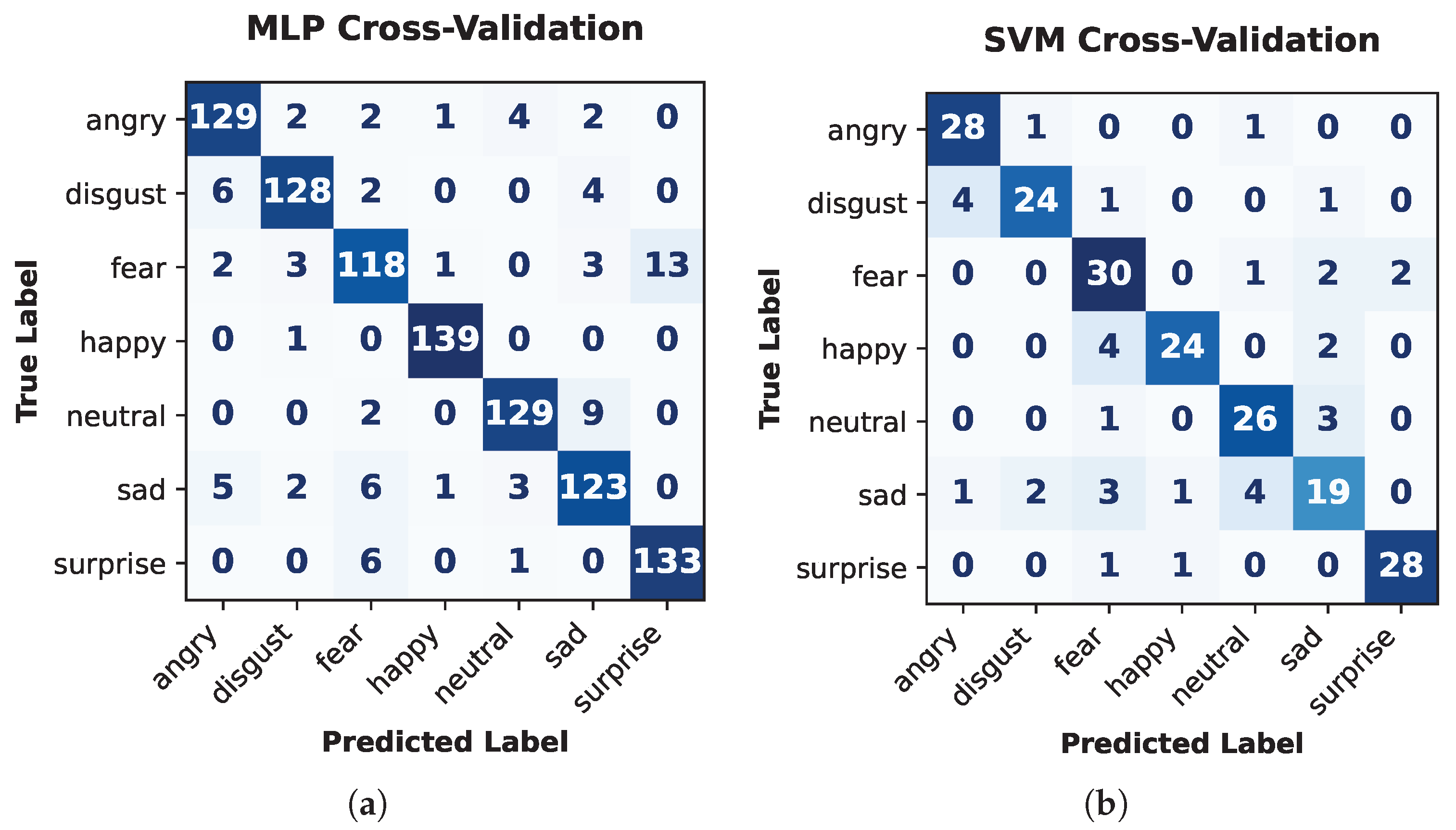 Figure 7 shows two confusion matrices for (a) MLP+DE on the KDEF database and (b) SVM+CP on the JAFFE database, respectively. Matrix (a) demonstrates superior results, marked by exceptionally high true positive counts across all emotions and very minimal confusion, with errors primarily isolated to instances like