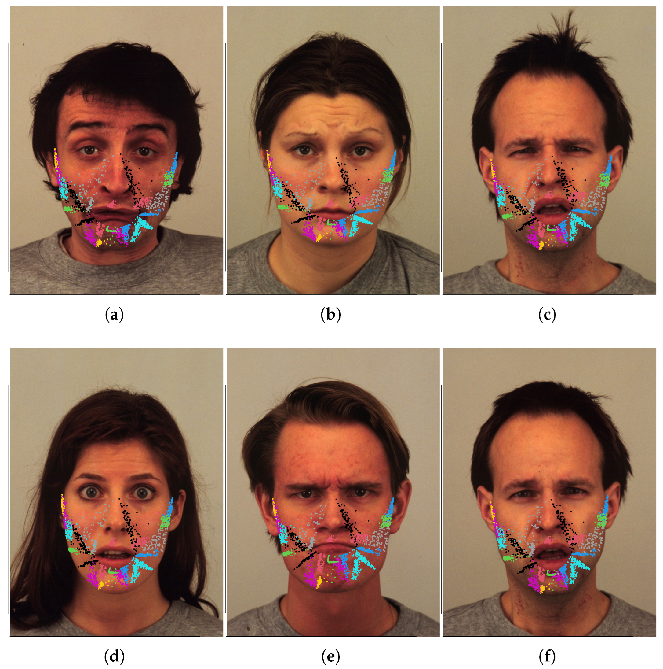 Disgust, strongly support the argument that these specific emotions are inherently ambiguous and difficult to classify, even for a high-performing model. This difficulty arises because the facial expressions share significant overlaps in their underlying muscle movements (Action Units): for example, both Fear and Surprise often involve wide eyes and an open mouth. Those errors are not mere methodological failures, but rather a reflection of the subtle individual variations and the blurring lines between emotion categories. Consider that these specific expressions would likely confuse even human observers due to their high structural similarity. The inner points added to the plots visually indicate where the model is focused, so these points may constitute a form of explainable AI (XAI). They reveal where the MLP+DE model is attending on the face—typically highlighting critical facial regions like the cheeks, mouth and chin, i.e., AUs [