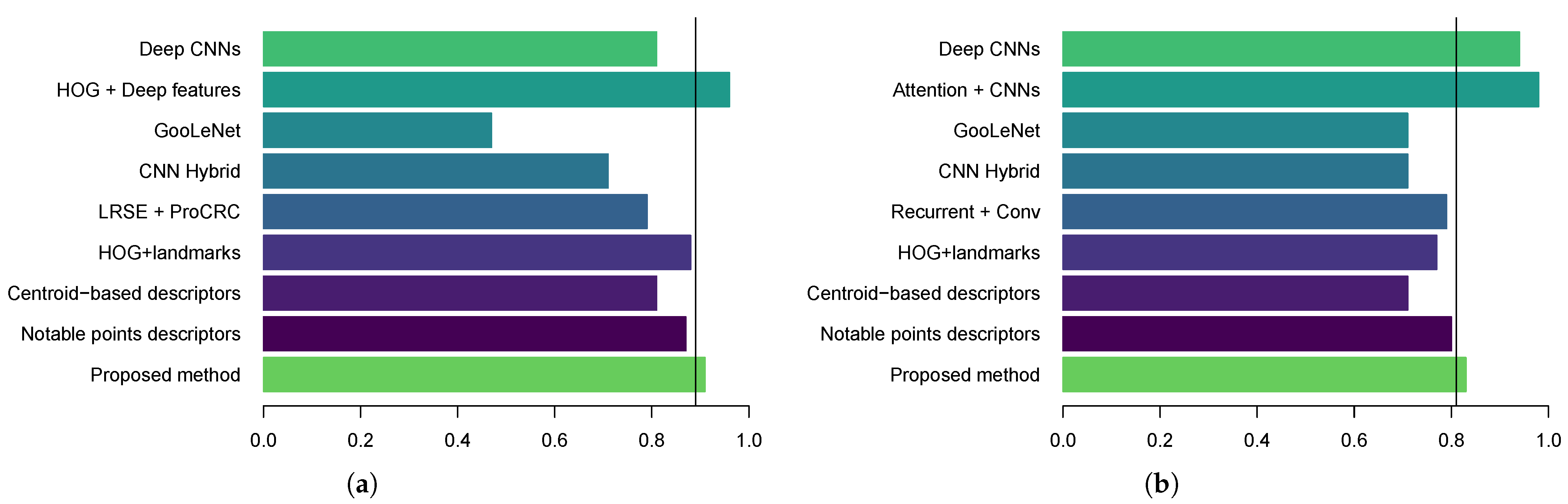 Figure 9 suggests that methodologies based on Deep Learning capture more discriminating information, the proposed method maintains the crucial advantage of modeling muscle action directly through continuously optimized geometric landmarks. This provides a white-box solution that explicitly validates the psychological plausibility of the Facial Action Coding System (FACS). The complexity of these attention-based deep learning models comes at the cost of explainability, whereas the proposed method remains fully transparent; it achieves competitive performance using inner points, making it a robust, computationally efficient, and highly explainable tool for emotion recognition.