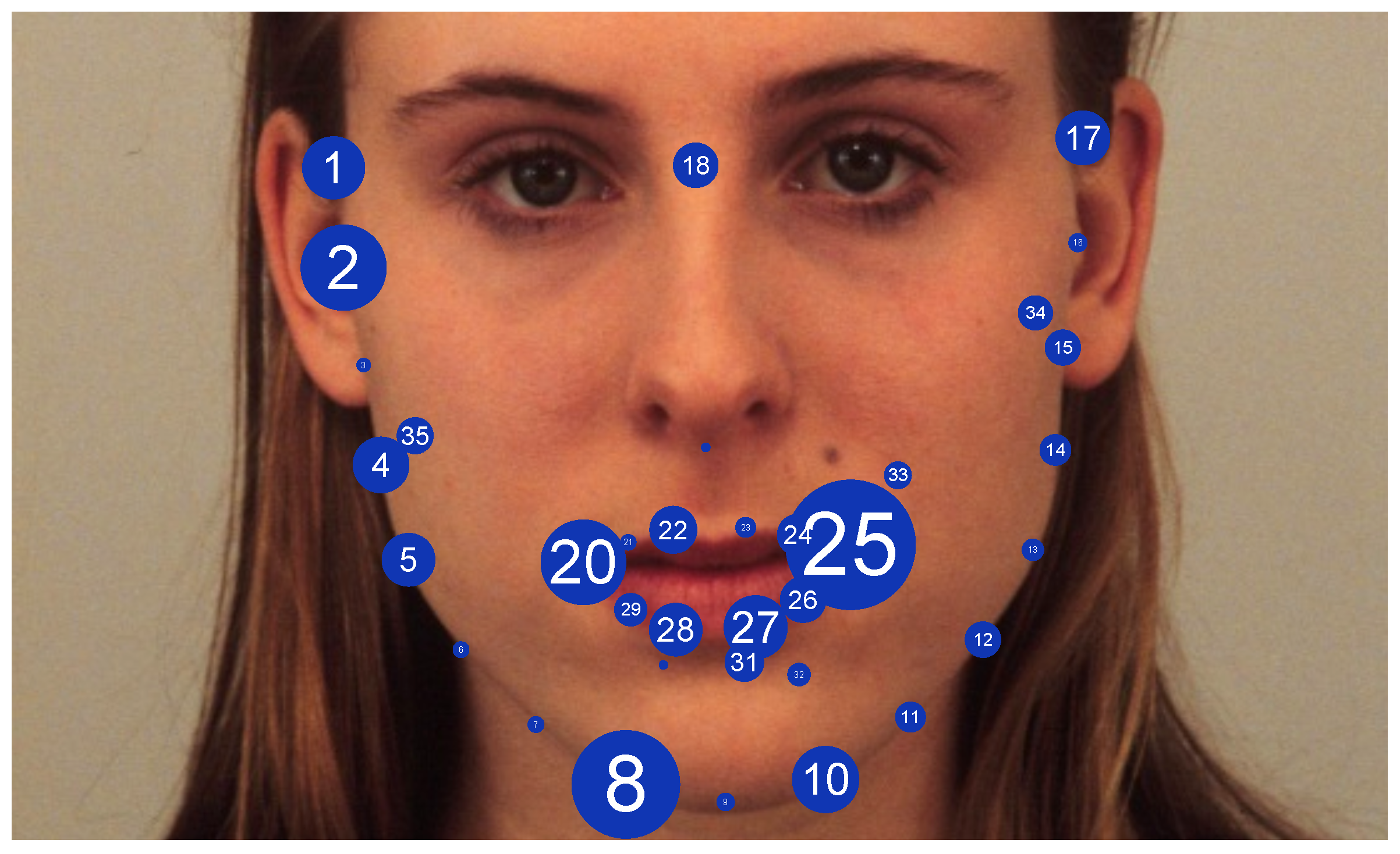 38]. In this context, the size of a landmark illustrates its relevance to the classification task. The points are numbered for reference. For instance, points 20 and 25 around the mouth are related to the Lip Corner Puller (AU12) and the Risorius (AU20). Similarly, points 5, 8, and 10 are associated with Jaw Drop (AU26), while points 1, 2, 17, and 18 capture the activation of the Inner Eyebrow Raiser (AU1) and the Outer Eyebrow Raiser (AU2).