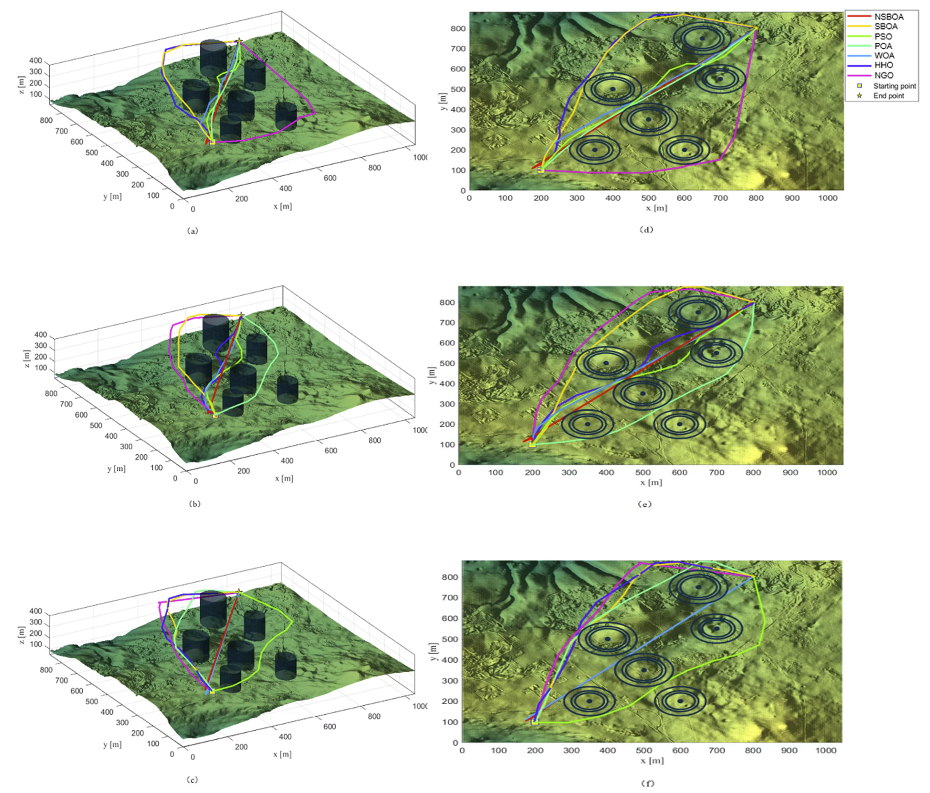 The scenarios used for evaluation are from real-world sites. In these real scenarios, the number and positions of threats (represented by black cylinders) are selected according to different levels of complexity. For comparison, we set the population size to 30, the maximum number of iterations to 200, the starting point of the flight to be (200, 100, 150), and the end point to be (800, 800, 150). There are 6 obstacles and 10 waypoints. The experimental results are shown in