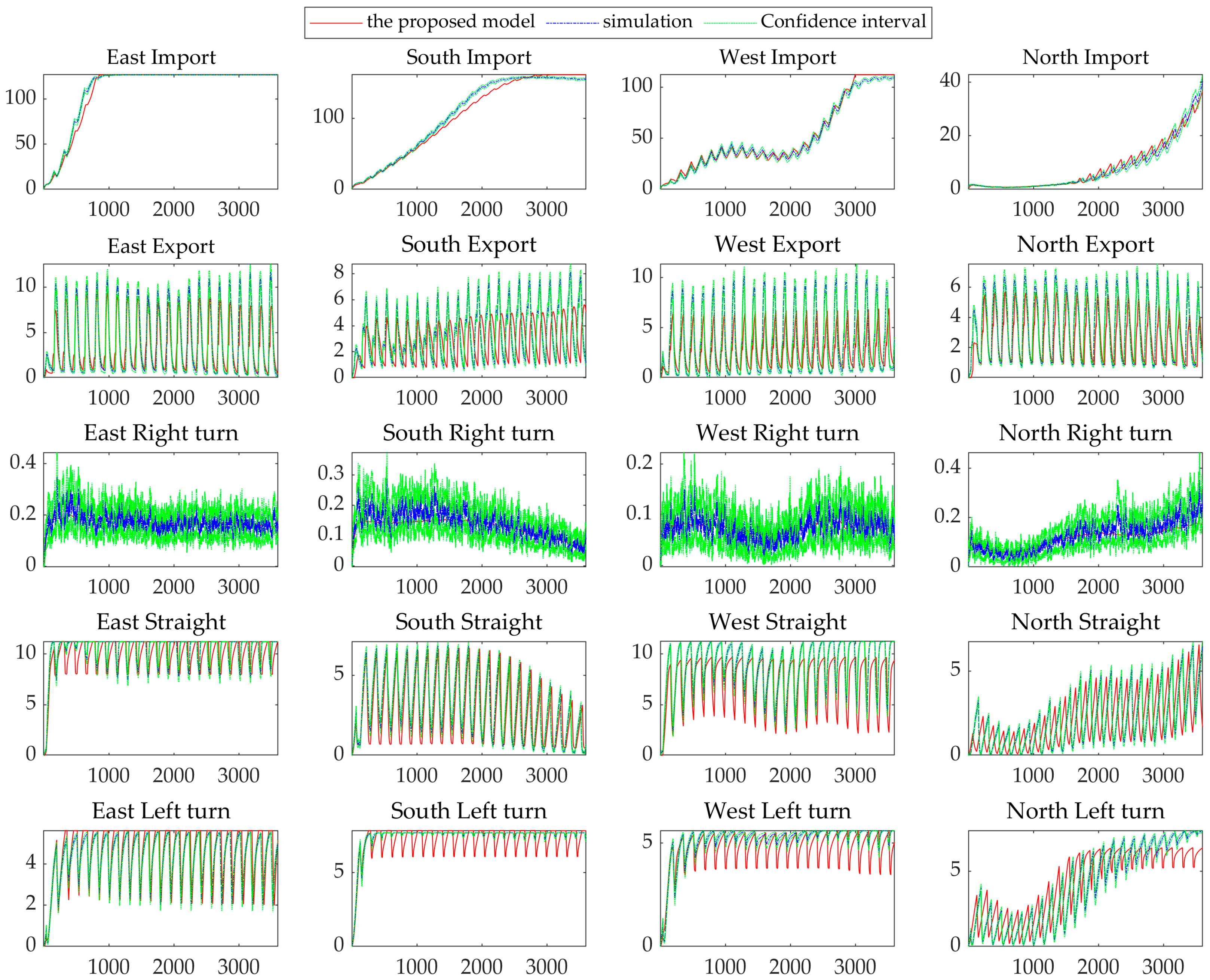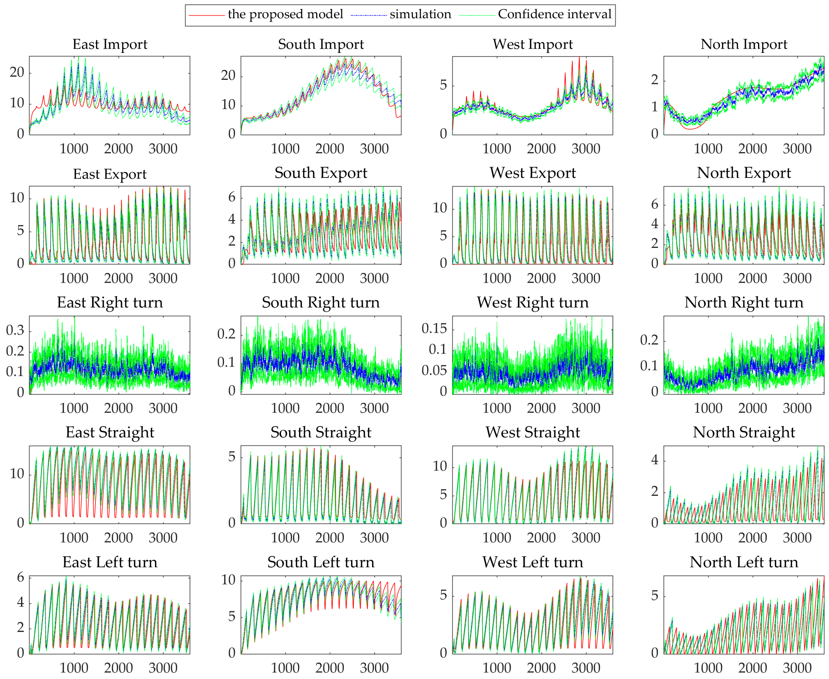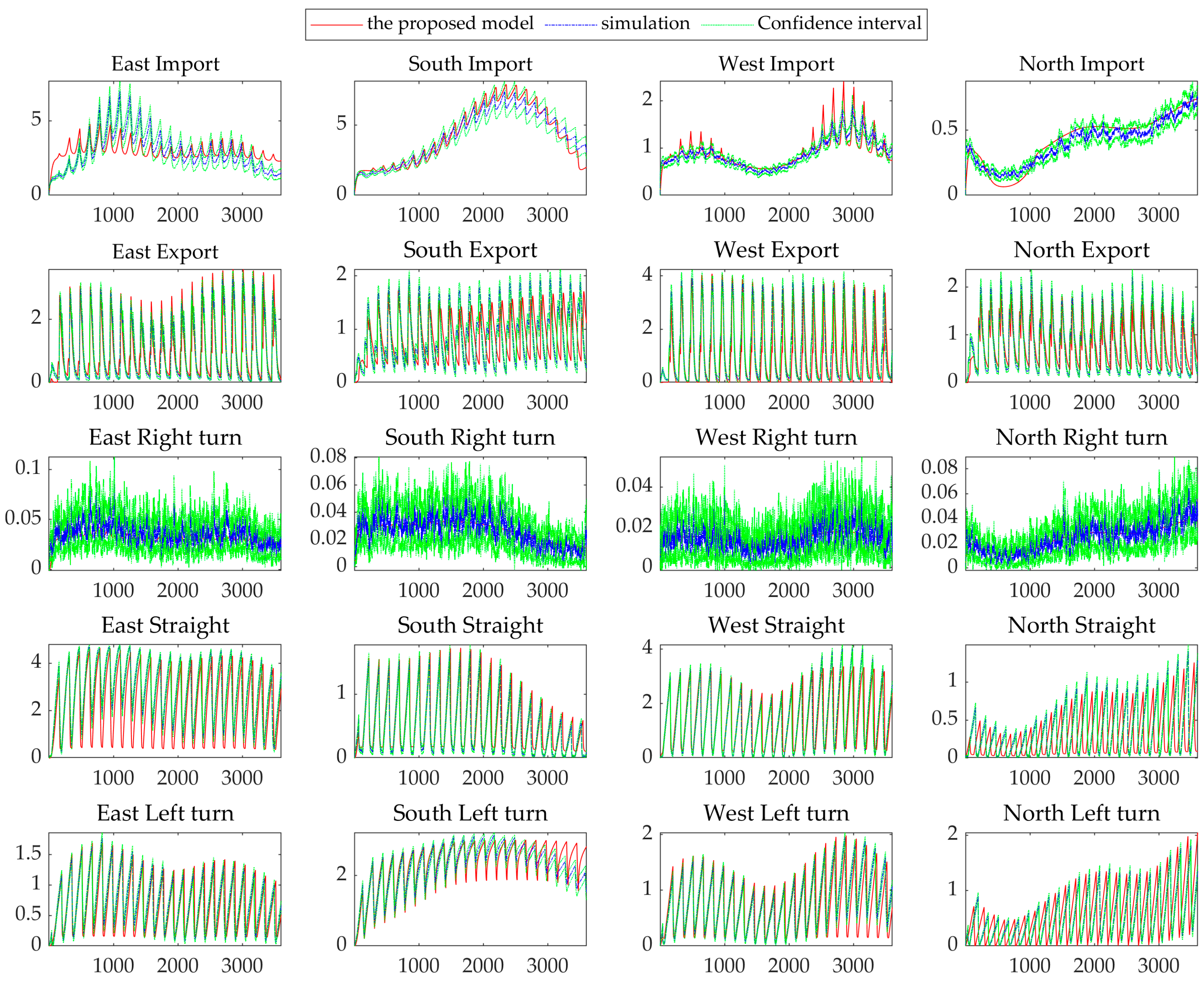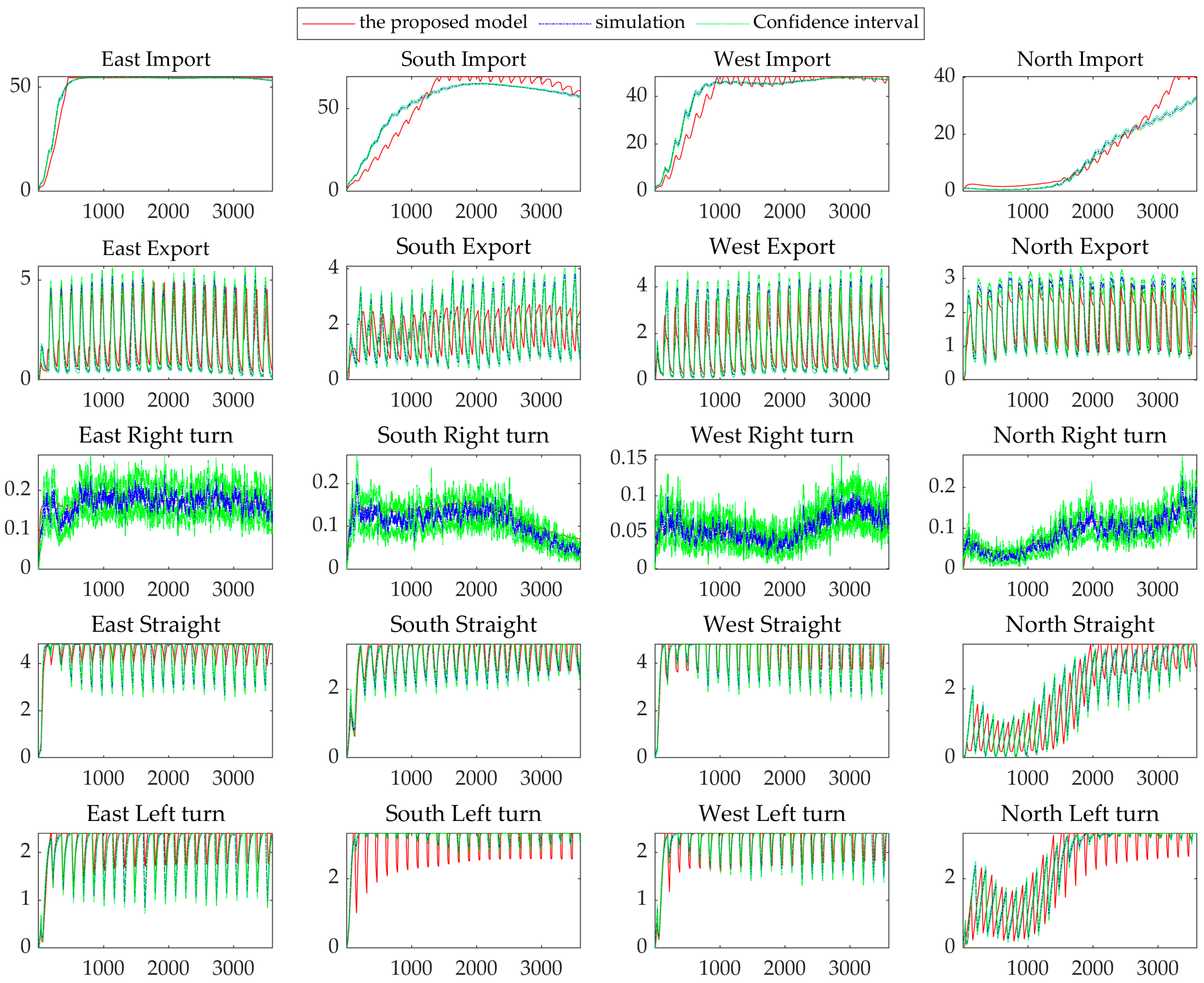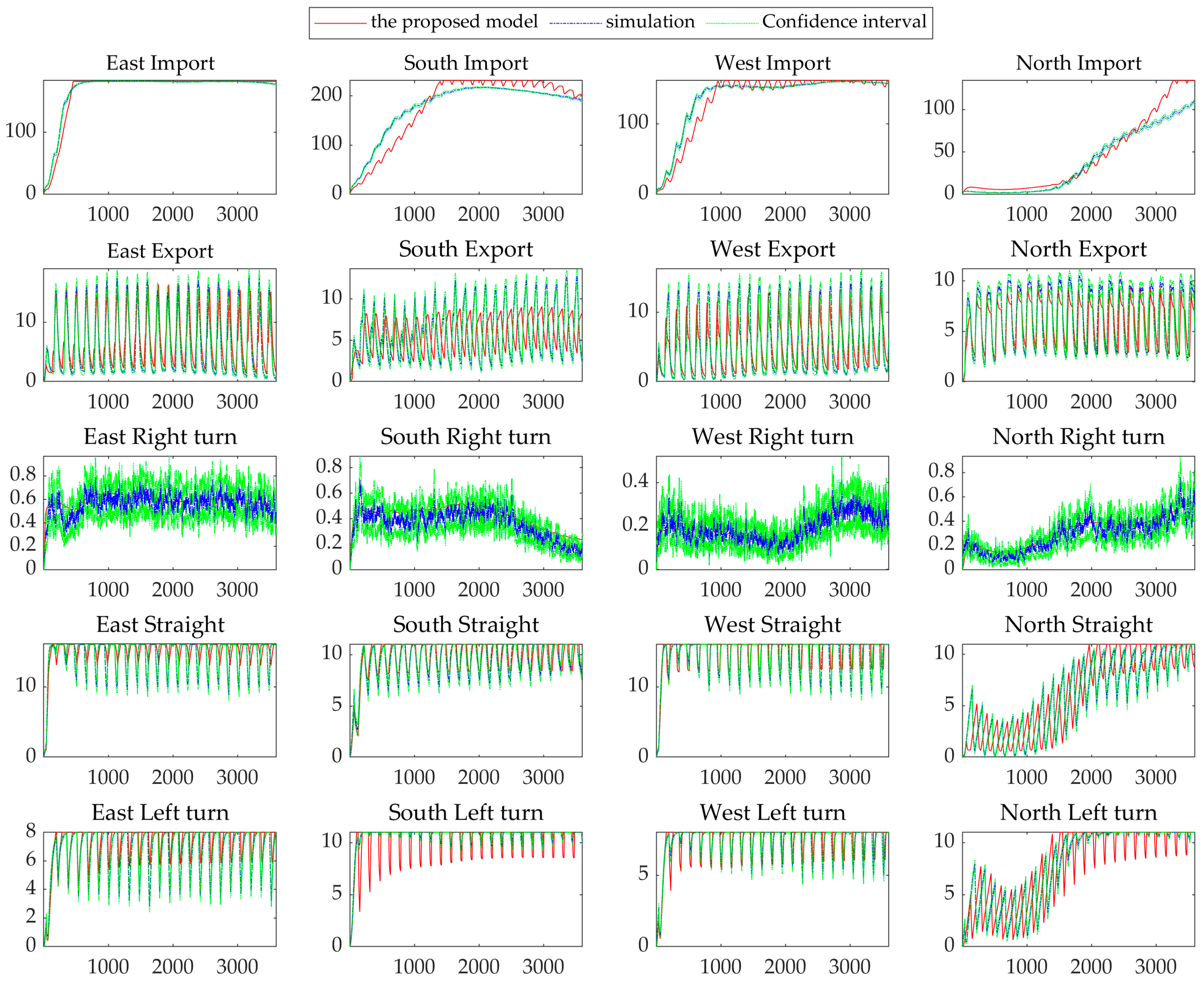 - Tolerating sensor failures (data loss): In practical deployment, if certain detectors fail, may not be directly available. The upstream-downstream flow relationship embedded in the model (Equation (18)) can then be leveraged for data imputation or state estimation. For instance, if an entry link detector fails, the estimated output rate from upstream links and historical turning ratios could be used to reconstruct , demonstrating the model’s robustness in a data-driven context.