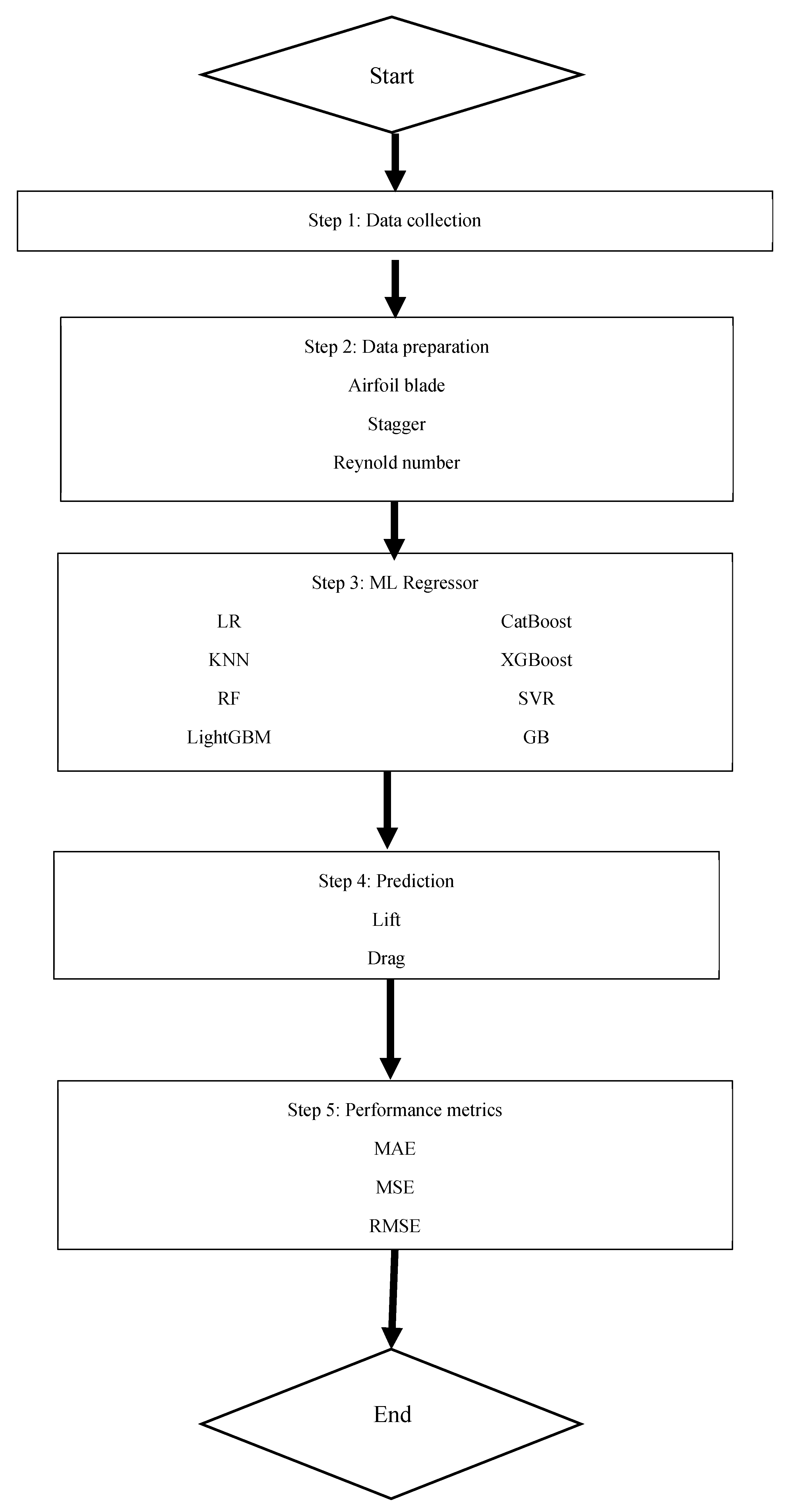 The prediction is performed using fundamental components of machine learning, the regressors. Machine learning regressors are algorithms designed to predict continuous numerical values based on input features. These models use labeled training data to establish relationships between the input variables and the target outputs. Common types of regressors include Linear Regression, K-Nearest Neighbor, Support Vector Regression, and neural networks. More sophisticated techniques, such as Random Forest and Gradient-Boosting Machines, are capable of capturing complex nonlinear relationships within the data. In this work we considered nine regressors for lift and drag prediction. The algorithms are LR, SVR, KNN, MLP, RF, GB, LightGBM, CatBoost, and XGBoost. Multivariate versions of the regressors are adopted here to predict the drag (Ftotx), lift (Ftoty), and moment (Mtotz). As can be seen from the hydro turbine parameters, where the values are a combination of numerical and categories, the regressor is trained using mixed data. The nine algorithms are briefly discussed below and summarized in