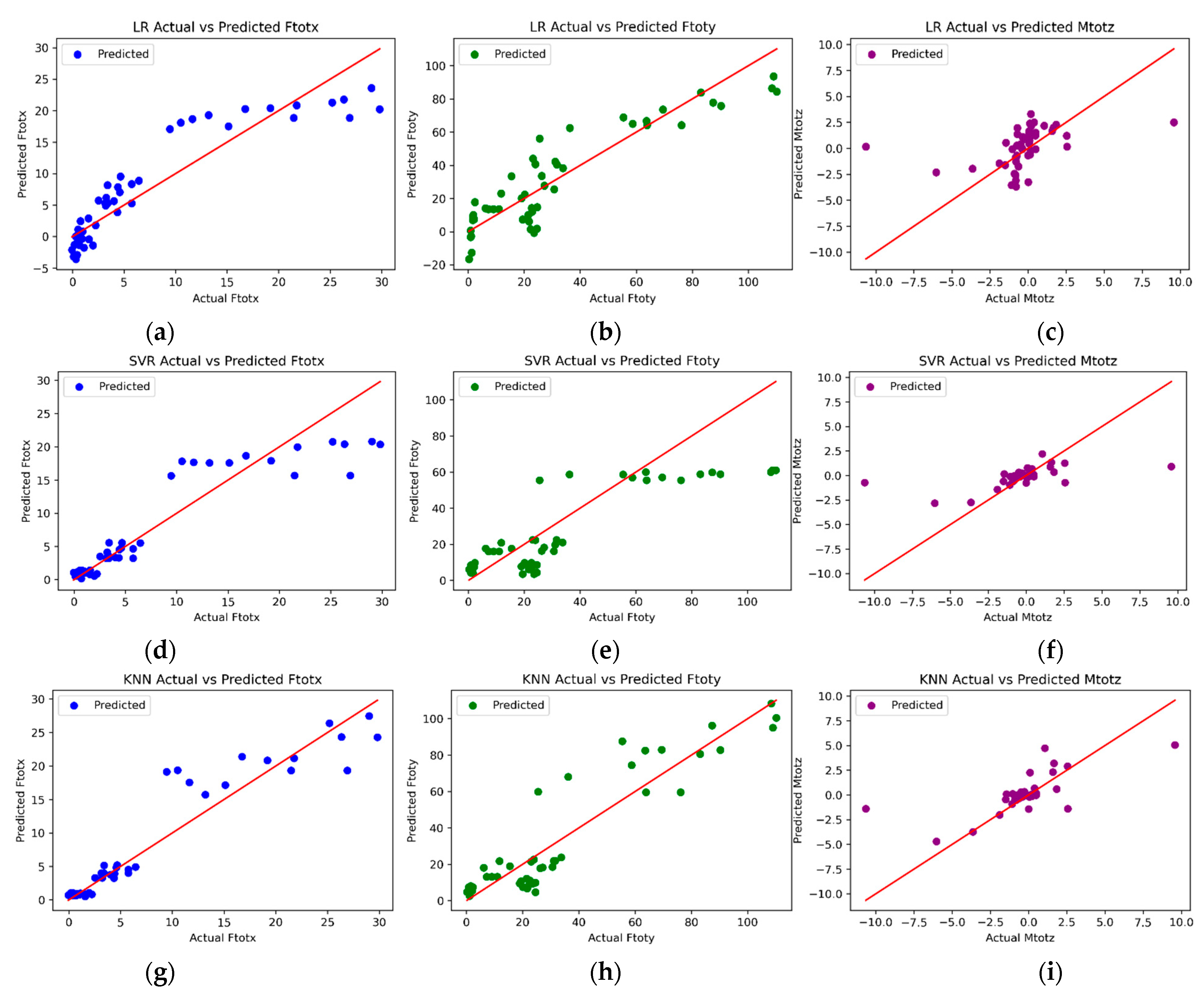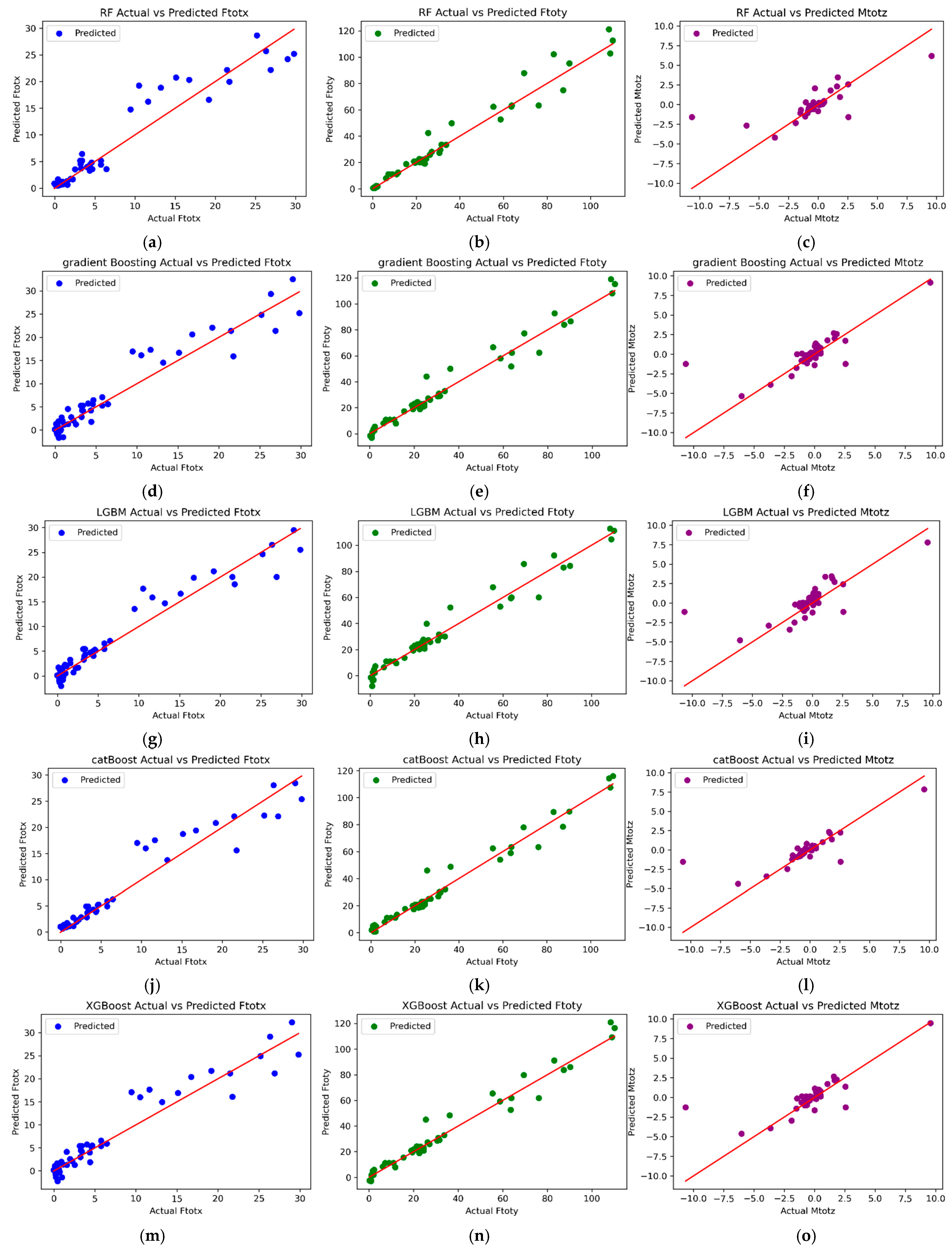 values and reduced MAE and RMSE. The close grouping of points to the ideal result line indicates that CatBoost performs effectively on all nonlinear relationships defining the hydrodynamic forces. In predicting drag force (Ftotx), LGBM demonstrates a marginally superior distribution of results in approach to the ideal model line compared to CatBoost, hence confirming its slightly enhanced accuracy in predicting drag force, as evidenced by the error analysis. However, in the prediction of lift force (Ftoty) and moment force (Mtotz), CatBoost demonstrated superior consistency again. In contrast, linear models like LR and SVR exhibit clear indications of underfitting, as evidenced by almost uniform scatter plots where the predicted values show minimal variance despite fluctuations in the actual values. These data indicate that linear models inadequately represent the intricate nonlinear relationships between blade geometry parameters, flow conditions, and resultant hydrodynamic forces. Tree-based ensemble models such as Random Forest, Gradient Boosting, and XGBoost have superior predictive trends compared to Linear Regression models. Nonetheless, the scatter plot distributions for these models exhibit greater oscillations for moment prediction, signifying subpar generalization capabilities. These models exhibit significantly lower performance in processing categorical variables and interaction terms compared to CatBoost models. The scatter plot analysis confirms the findings of the quantitative evaluation, demonstrating that the predictions generated by the CatBoost model are the most precise and consistent for the output parameters of drag, lift, and moment.