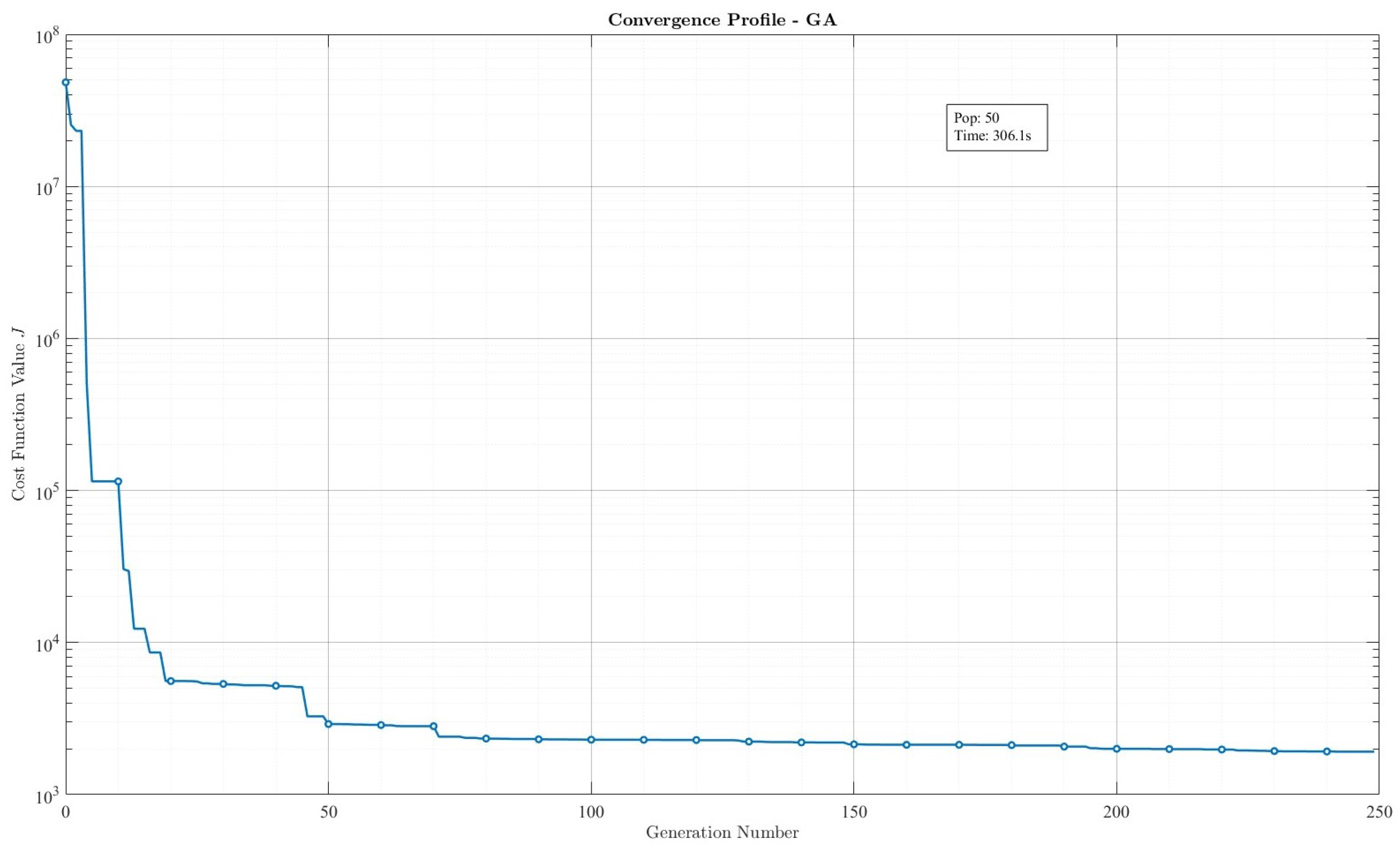 The implementation was carried out in MATLAB R2024a, utilizing the Global Optimization Toolbox and the Parallel Computing Toolbox. With this setup, the GA runtime is approximately 5 min on a workstation equipped with a 24-core Intel Core i9 processor and 32 GB of RAM.