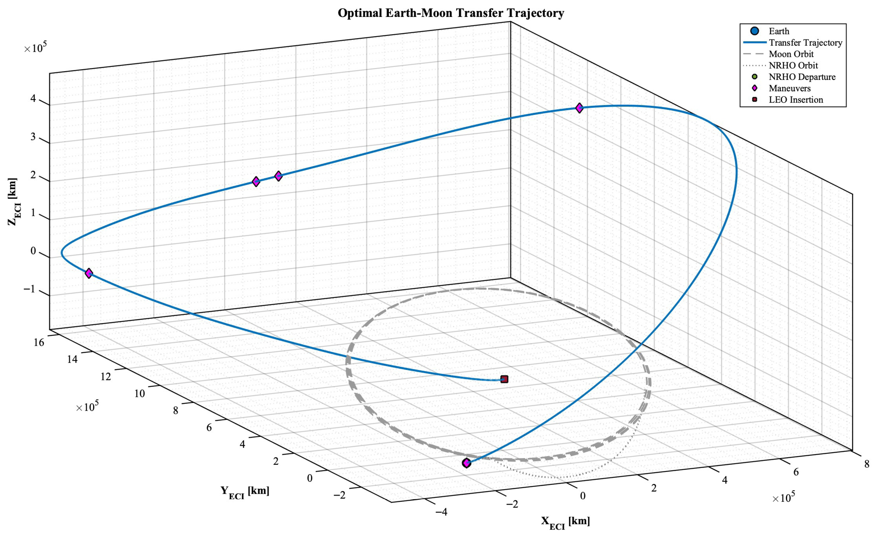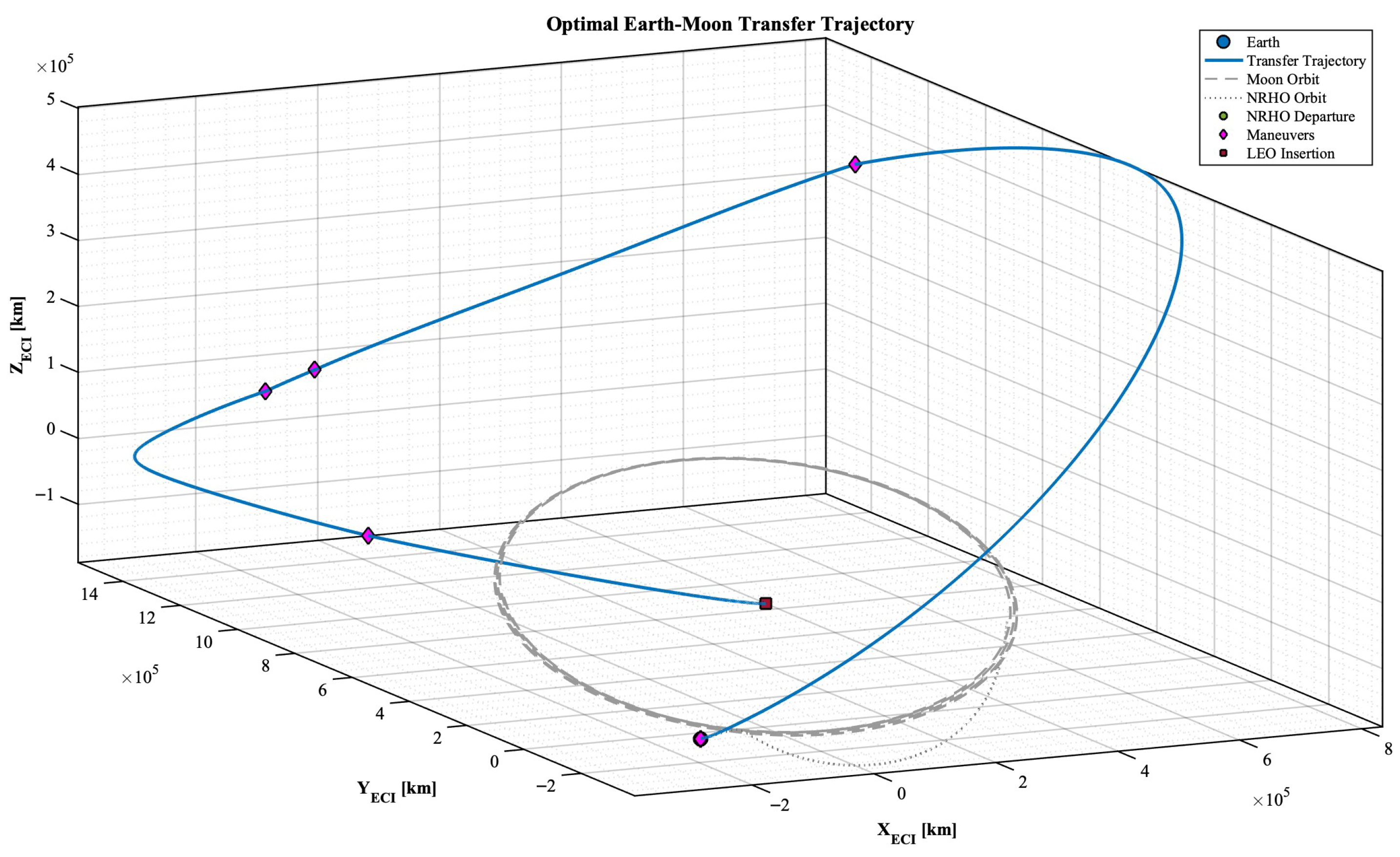Finally, the analysis reveals a sensitivity to both the departure epoch and the insertion point in the NRHO. This suggests that a purely local optimization from a single guess may not be sufficient. A more robust approach would involve initiating a series of local optimizations (a multi-start approach) from slightly varied initial conditions centered around a promising GA solution. Furthermore, before finalizing a trajectory, its robustness should be validated by introducing small perturbations to the segment times and maneuver epochs to ensure the solution remains stable and feasible.