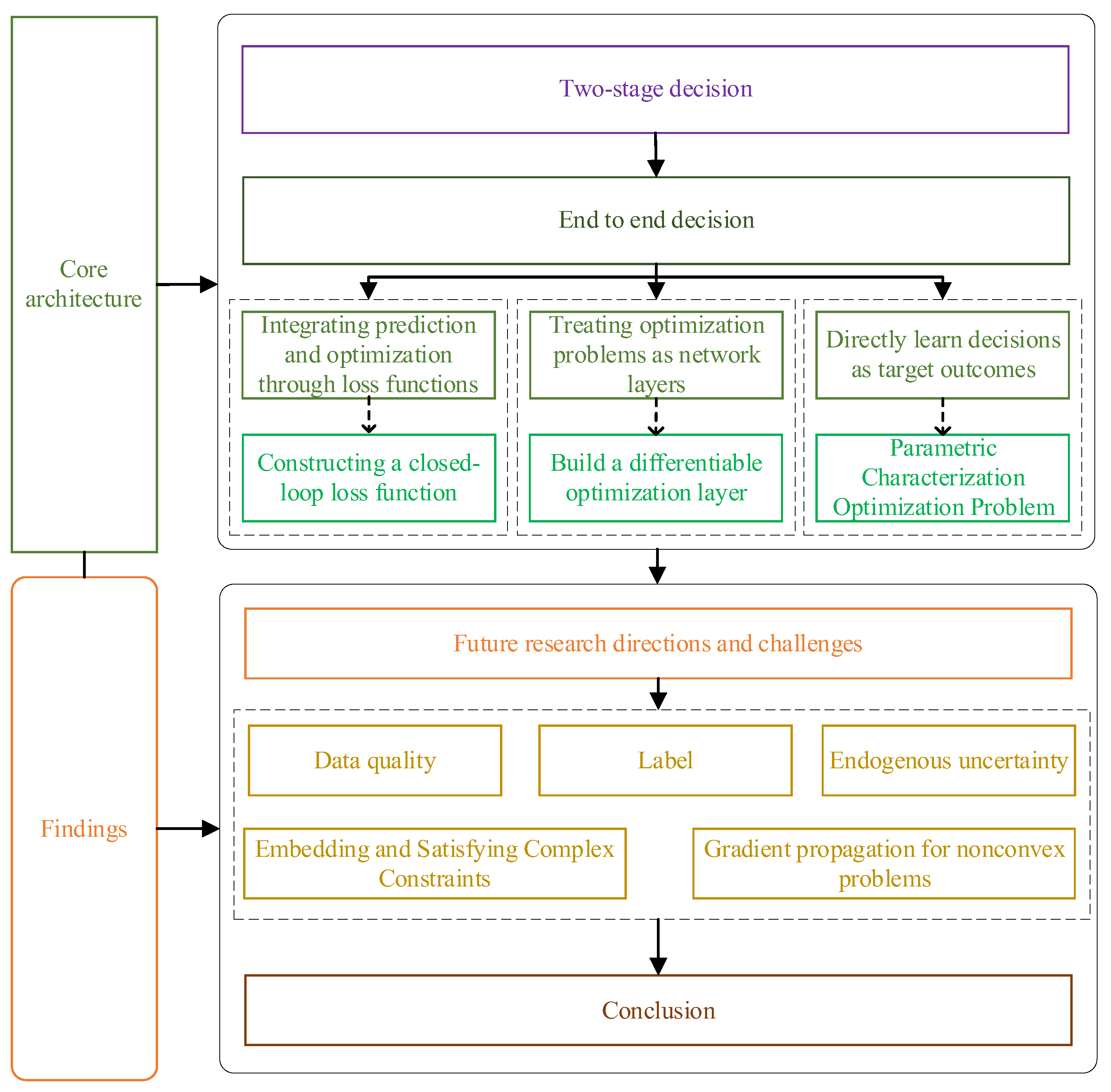 - Critical Synthesis of Challenges and Opportunities: This review identifies and analyzes the challenges facing end-to-end decision optimization in practical scenarios—including issues related to data, complex constraints, non-convexity, decision-dependent uncertainty—and highlights emerging opportunities for future research.