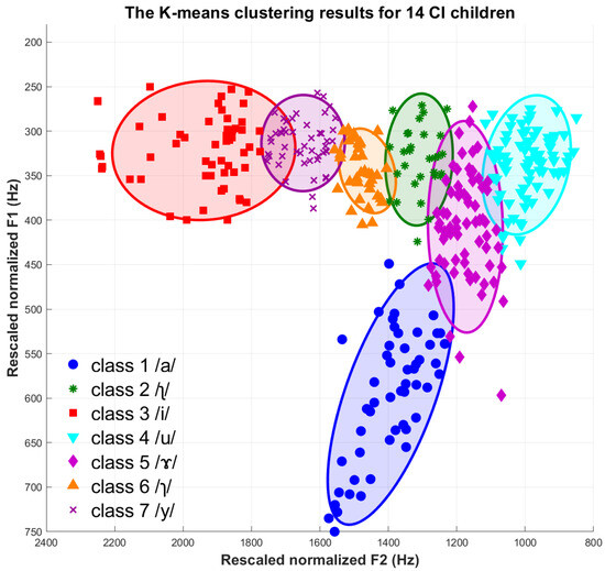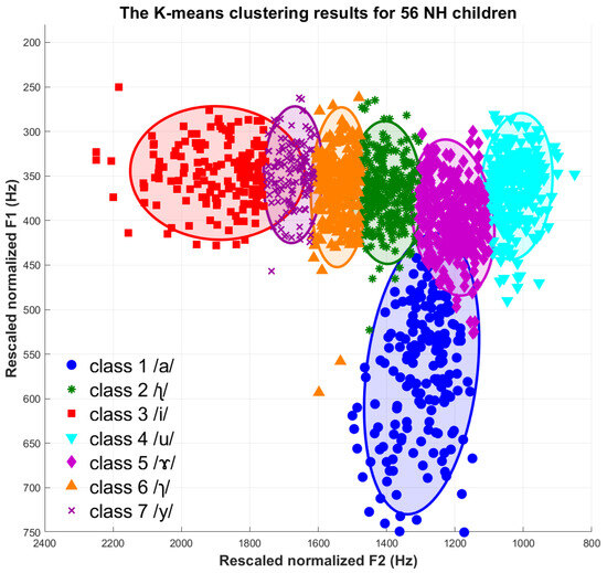 K-means clustering revealed markedly different vowel-space distributions for the two groups (Figure 2 and Figure 3). Data from the normal-hearing children (n = 56) formed tight, elliptical clusters with crisp boundaries and minimal overlap, whereas the CI group (n = 14) produced looser, more diffuse clusters whose ellipses were larger and showed substantial overlap across vowel categories.