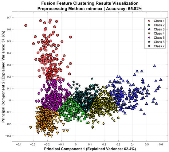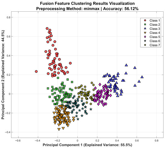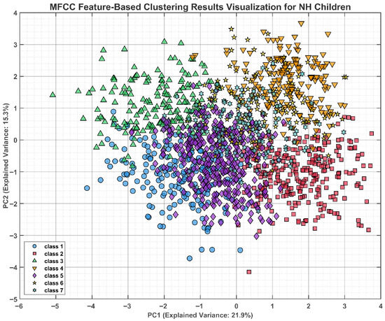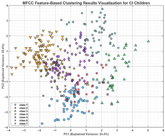 To enhance representational capacity, we conducted clustering on the fused-feature set (Figure 8 and Figure 9). After min–max normalisation, the combined representation yielded clearer separation in the principal-component space than any single-feature model. Clustering accuracy rose to 65.82 % for normal-hearing children (PC1 variance = 62.4 %) and to 56.12 % for the cochlear-implant group (PC1 variance = 55.5 %), surpassing the corresponding single-feature results. Visually, fusion tightened within-class cohesion and enlarged between-class margins along PC1-PC2, indicating that integrating multiple acoustic domains provides a more comprehensive description of the speech signal. Nevertheless, the implant group remained markedly less accurate than the normal hearing group, and the inter-group gap did not appreciably narrow, underscoring that the intrinsic variability inherent to paediatric cochlear-implant users persists even after feature fusion. The modest absolute accuracies further highlight the complexity of the problem and suggest that more sophisticated feature-extraction or classification techniques will be required.