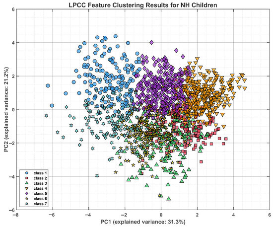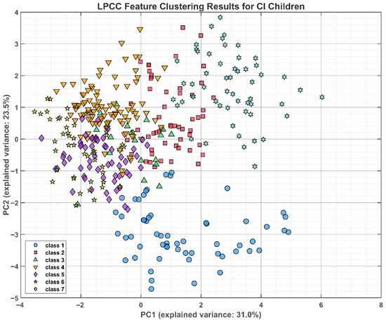 To reduce the dimensionality of LPCCs and MFCCs while preserving maximum variability in the original acoustic features, principal component analysis (PCA) was employed. The variance contribution ratio of each principal component (PC)—a metric reflecting the extent to which the component captures original feature variation—was calculated as the ratio of the target PC’s eigenvalue to the sum of all eigenvalues from the feature covariance matrix. PCA-based clustering of LPCC and MFCC features revealed distinct acoustic-space distributions for the two groups (Figure 4, Figure 5, Figure 6 and Figure 7). For LPCC, PC1 accounted for 31.3% of the variance in NH children and 31.0% in the CI group, indicating comparable explanatory power. Nevertheless, the NH children formed markedly tighter clusters in the PC1-PC2 plane, with high within-class cohesion and well-defined between-class boundaries. In contrast, the children with CIs showed a more dispersed pattern, larger inter-category overlap, and fuzzier decision boundaries. An identical trend was observed for MFCC: PC1 accounted for 21.9% of the variance in the NH group versus 24.3% in the CI group, yet the former showed denser, more well-demarcated clusters, while the latter was characterized by lower feature dimensional complexity, stemming from articulatory deviations or noise dominance and ultimately resulting in prominent category overlap. To further quantify the clustering results, we show the clustering indicators for NH and CI children in Table 1 and Table 2.