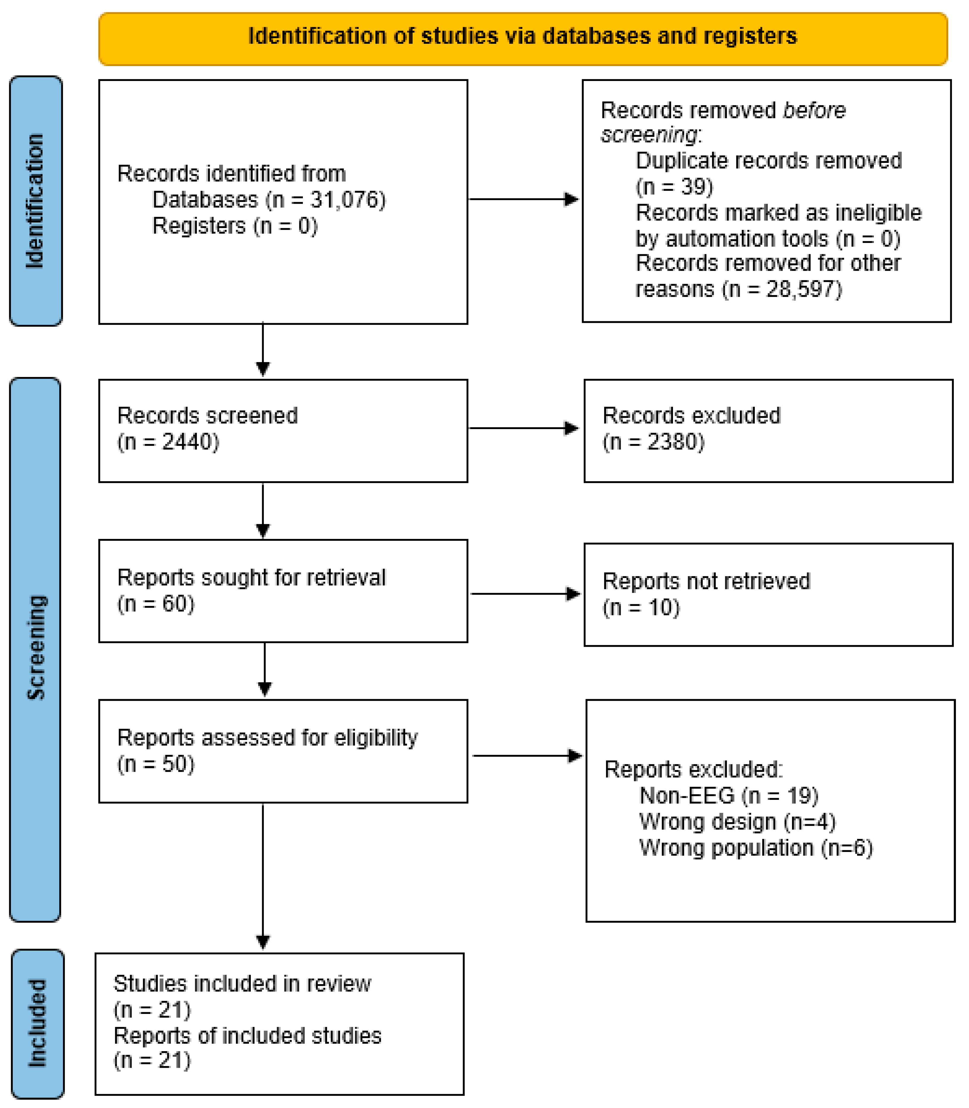 The article selection process worked as follows. Two reviewers independently evaluated the studies that met the selection criteria. All disagreements were discussed, and a consensus was reached. Each study was analyzed in terms of EEG data types, preprocessing methods, population characteristics, validation methods, and the list of characteristics for these models, as well as the models themselves.