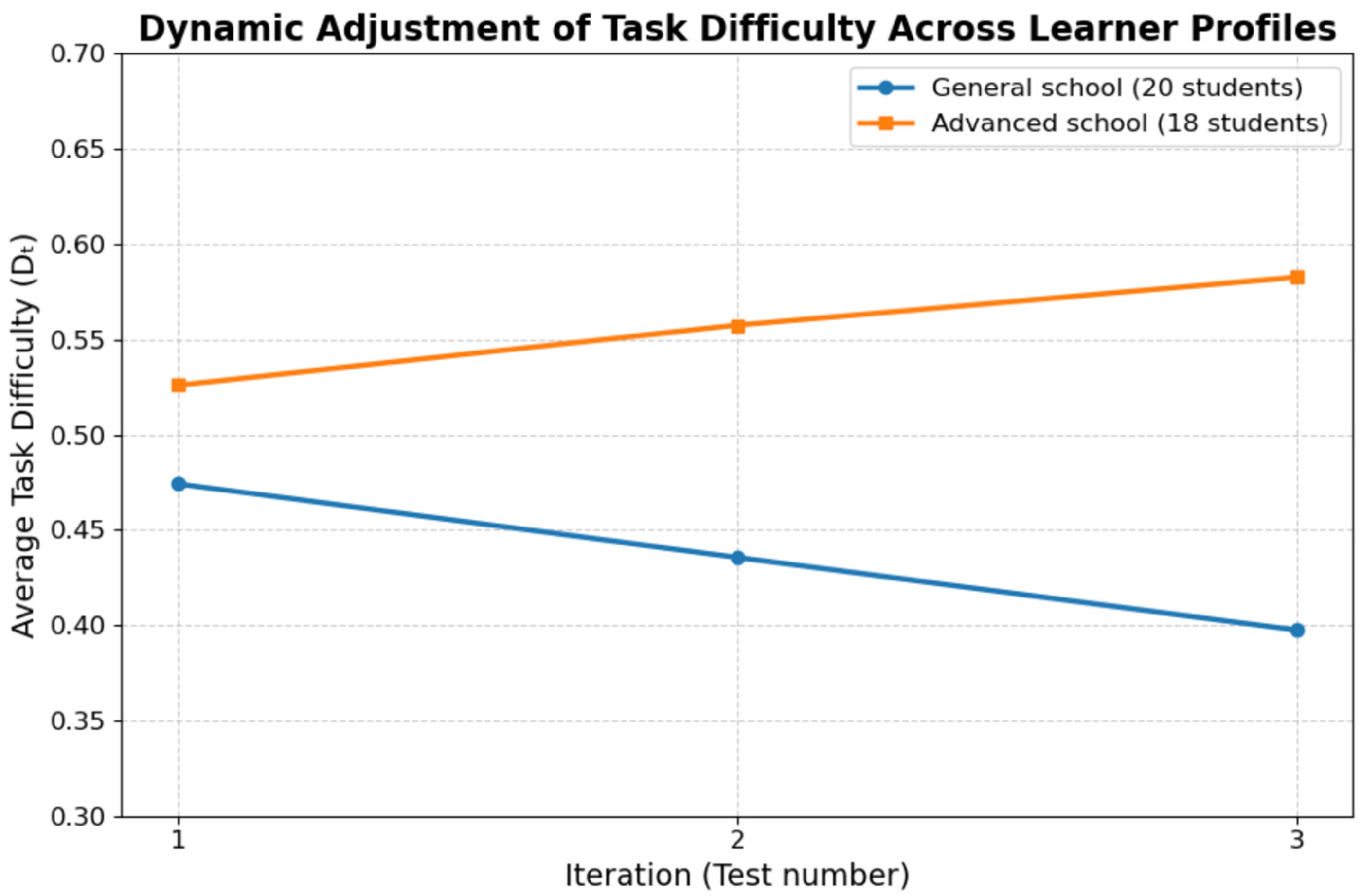 Figure 2 shows how the adaptive difficulty level changes over the iterative learning process for two different groups of learners. For normal secondary school-level learners, it can be seen that the level of difficulty increases gradually from an average level to finally hover around levels of 0.45 to 0.50 by the third iteration.