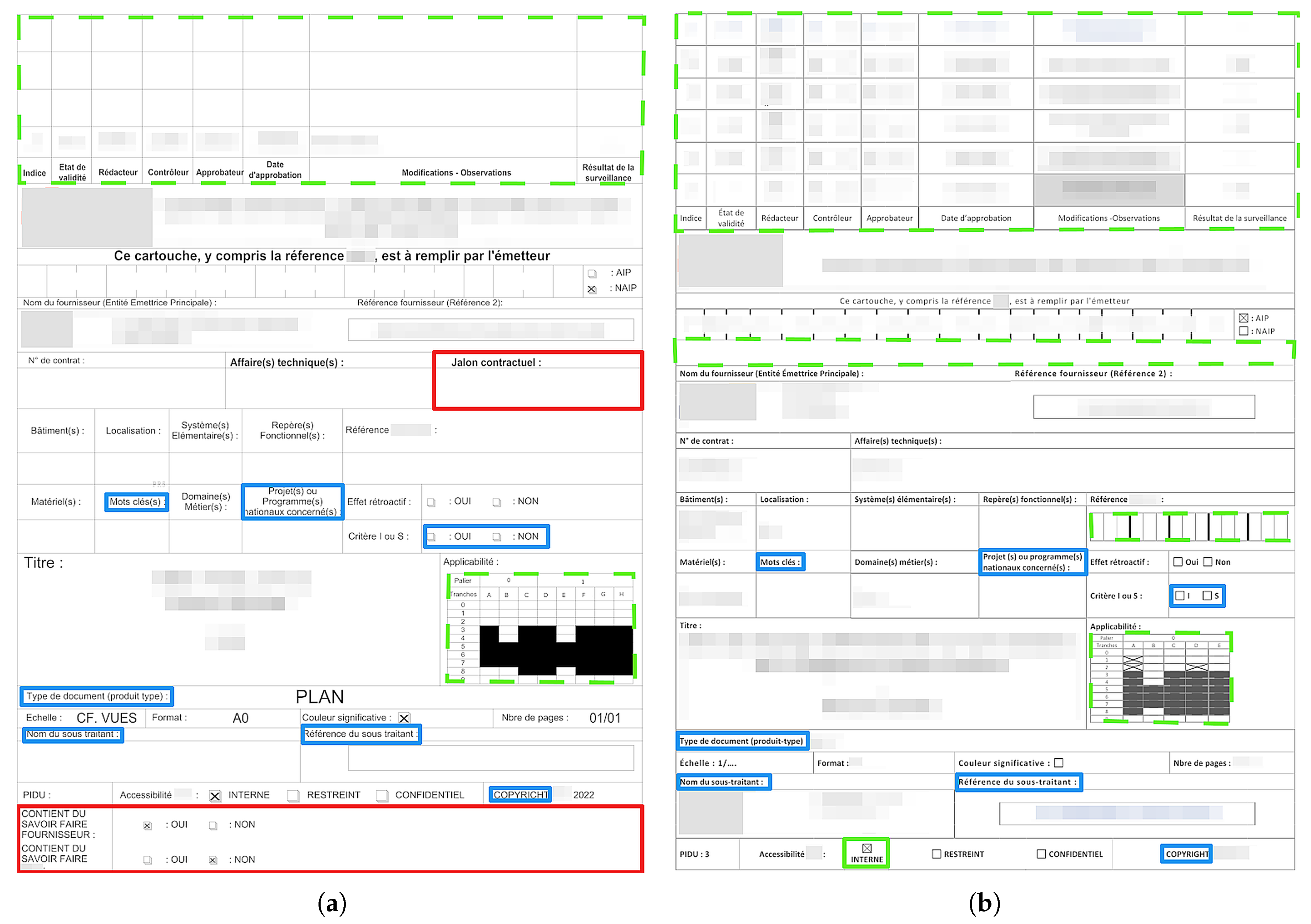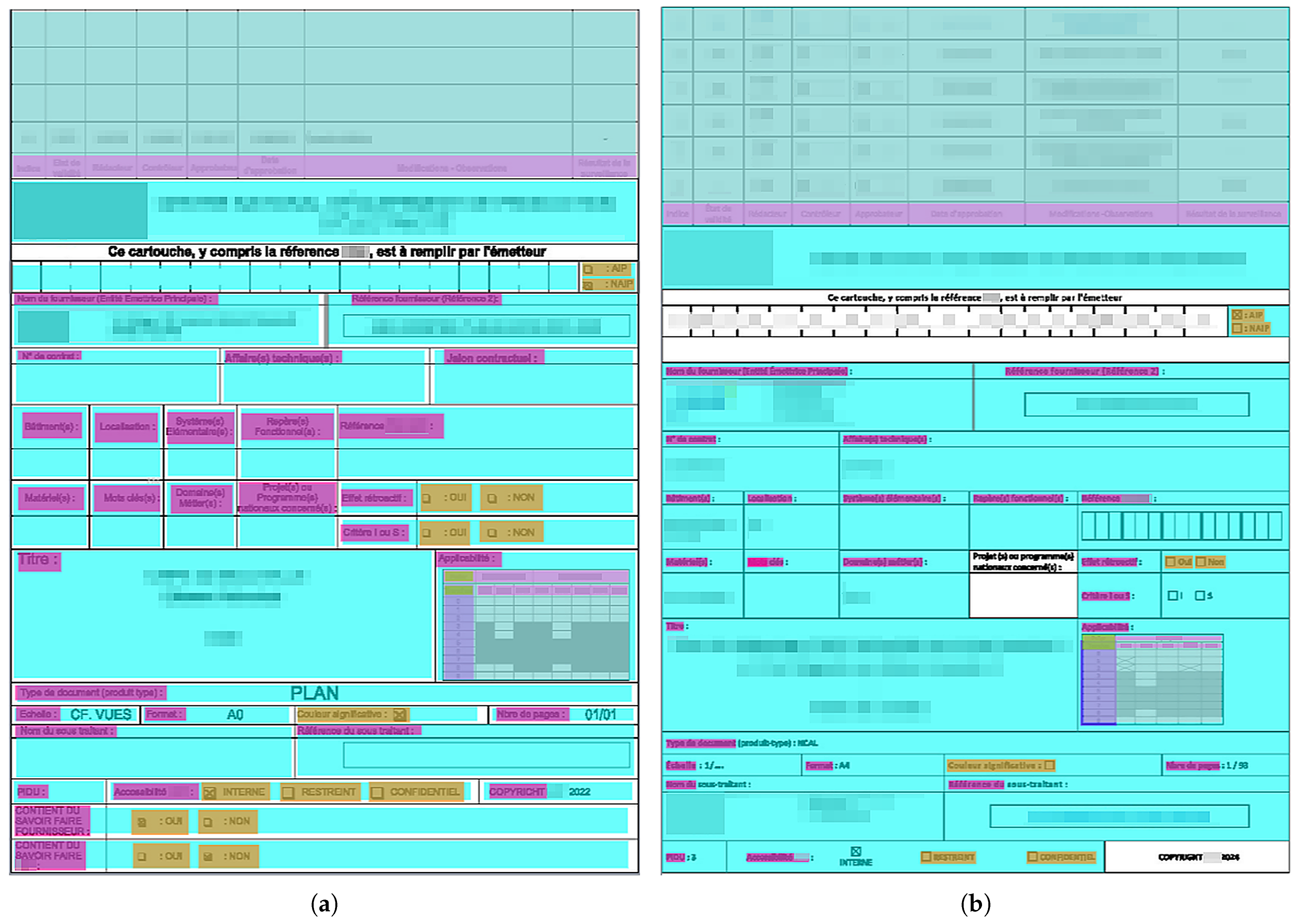 Figure 1. Ensuring the accuracy of the title block is critical, as inconsistencies or irregularities transmitted to a client or integrated into internal tracking and approval process may constitute a contractual non-conformance, potentially triggering internal investigations that are costly in terms of time and resources. This underscores the need for automating title block verification to reduce the workload on engineers while proactively minimizing errors in client deliverables. In industrial contexts, this need is further amplified by the heterogeneity of document production environments. Engineering deliverables are often produced by multiple contractors and subcontractors, who may rely on different authoring tools and do not necessarily benefit from dedicated title block validation features embedded in their design software. As a result, compliance cannot be guaranteed at creation time and must instead be assessed a posteriori on the delivered documents, independently of the software originally used to generate them. Moreover, because the title blocks considered in this work typically originate from modern digital workflows (e.g., native CAD exports or high-quality PDFs), image degradation is not the primary difficulty addressed here. Rather, the challenge lies in reliably identifying structural non-compliances (e.g., missing or merged cells, misplaced fields, inconsistent tabular organization) and communicating them in an actionable manner.