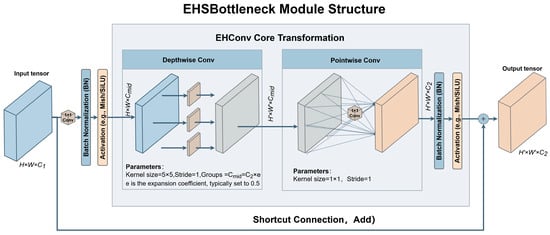 In the main branch, each EHSBottleneck maintains consistent input and output channel counts, performing feature transformation at a fixed spatial resolution. Specifically, EHConv is uniformly configured with stride = 1, undertaking only spatial structure modeling and channel semantic reorganization without introducing additional downsampling. This ensures consistent feature dimensions between the two split branches in the CSP-style structure and in the subsequent aggregation stage, avoiding extra scale alignment operations and effectively reducing structural complexity [28].
