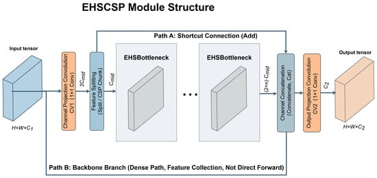 Let the input feature map be denoted as . First, a 1 × 1 convolution (CV1) adjusts the channel dimension, mapping the features to . In this step, we introduce a channel compression coefficient (set to in this work) to map the features to , thereby controlling the overall computational scale while preserving representational capacity. Subsequently, the features are split equally along the channel dimension into two branches: one serves as the cross-stage collateral branch (Path A), retaining shallow information directly; the other serves as the main branch (Path B), entering a stacked structure composed of multiple EHSBottlenecks for progressive feature transformation.