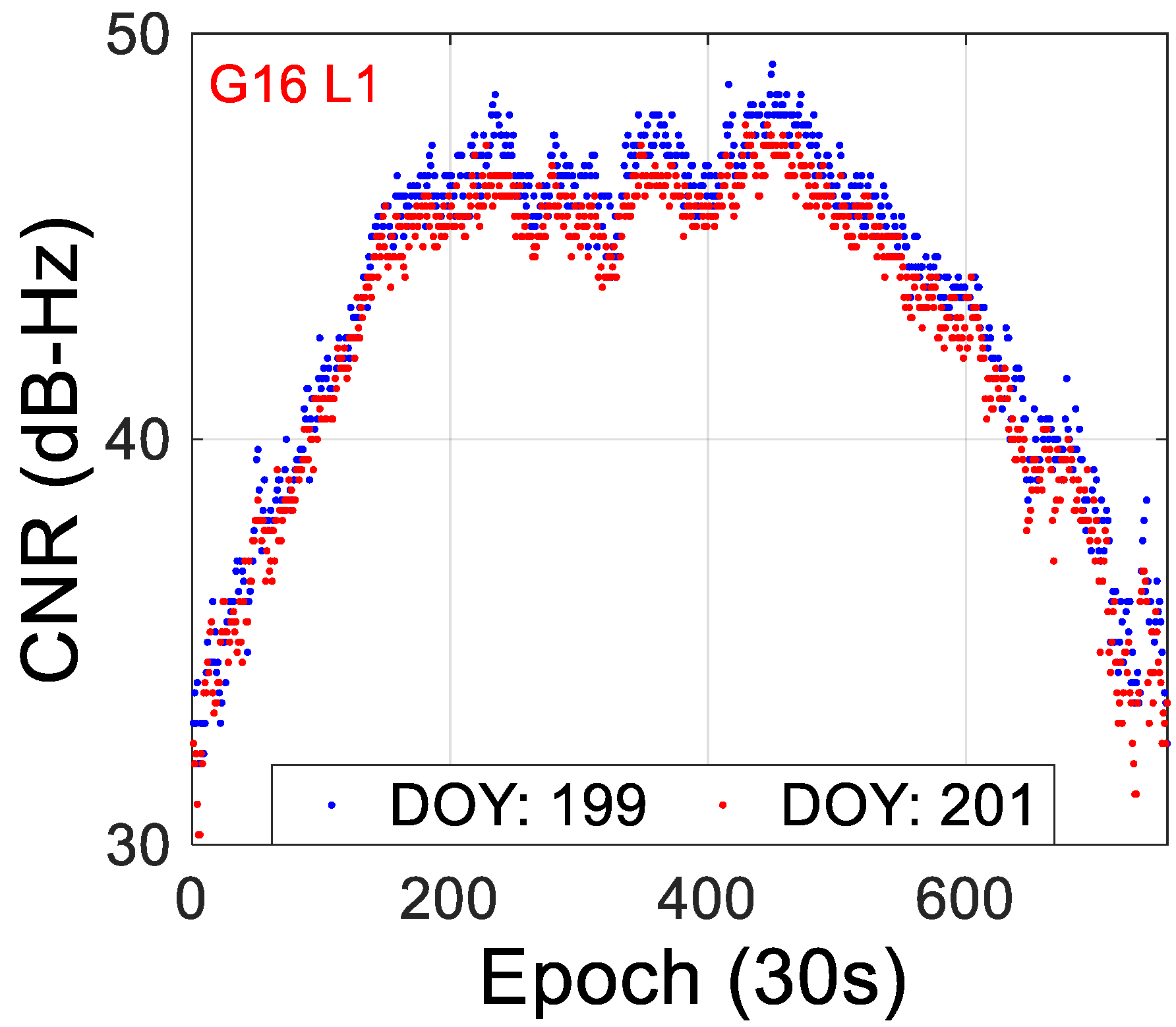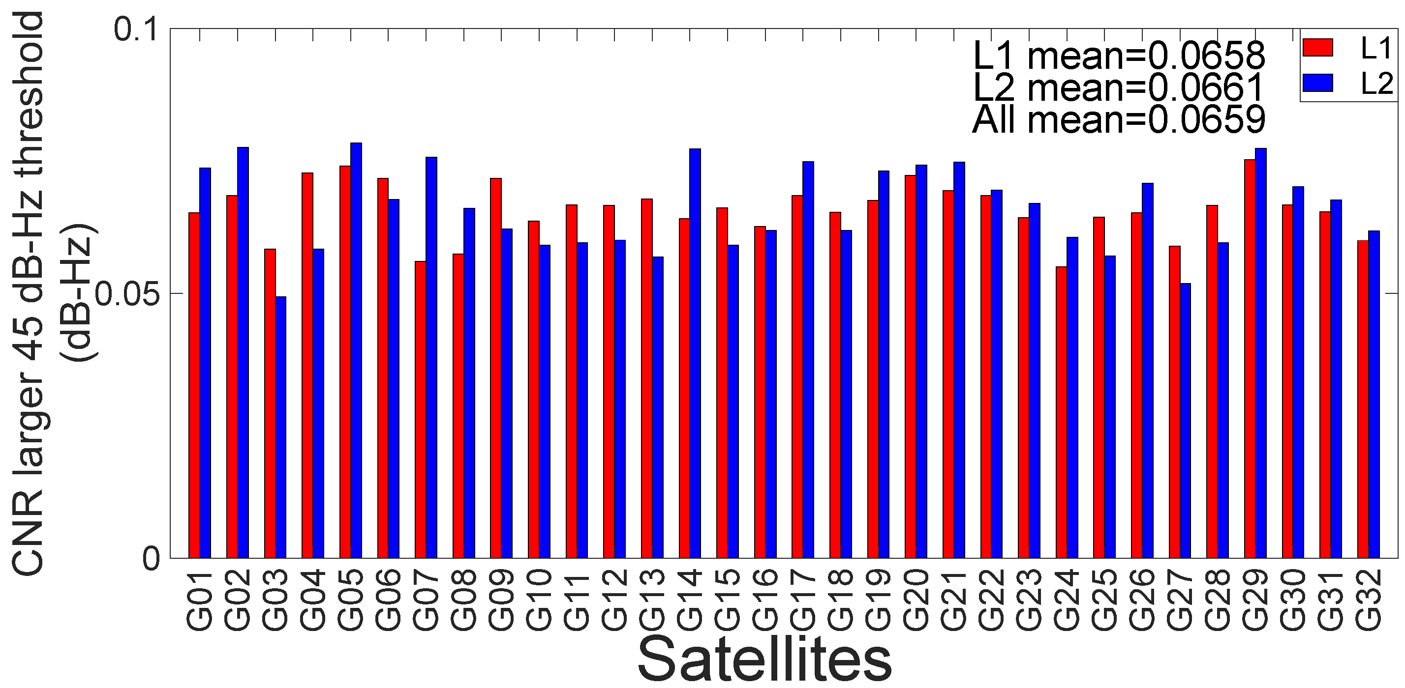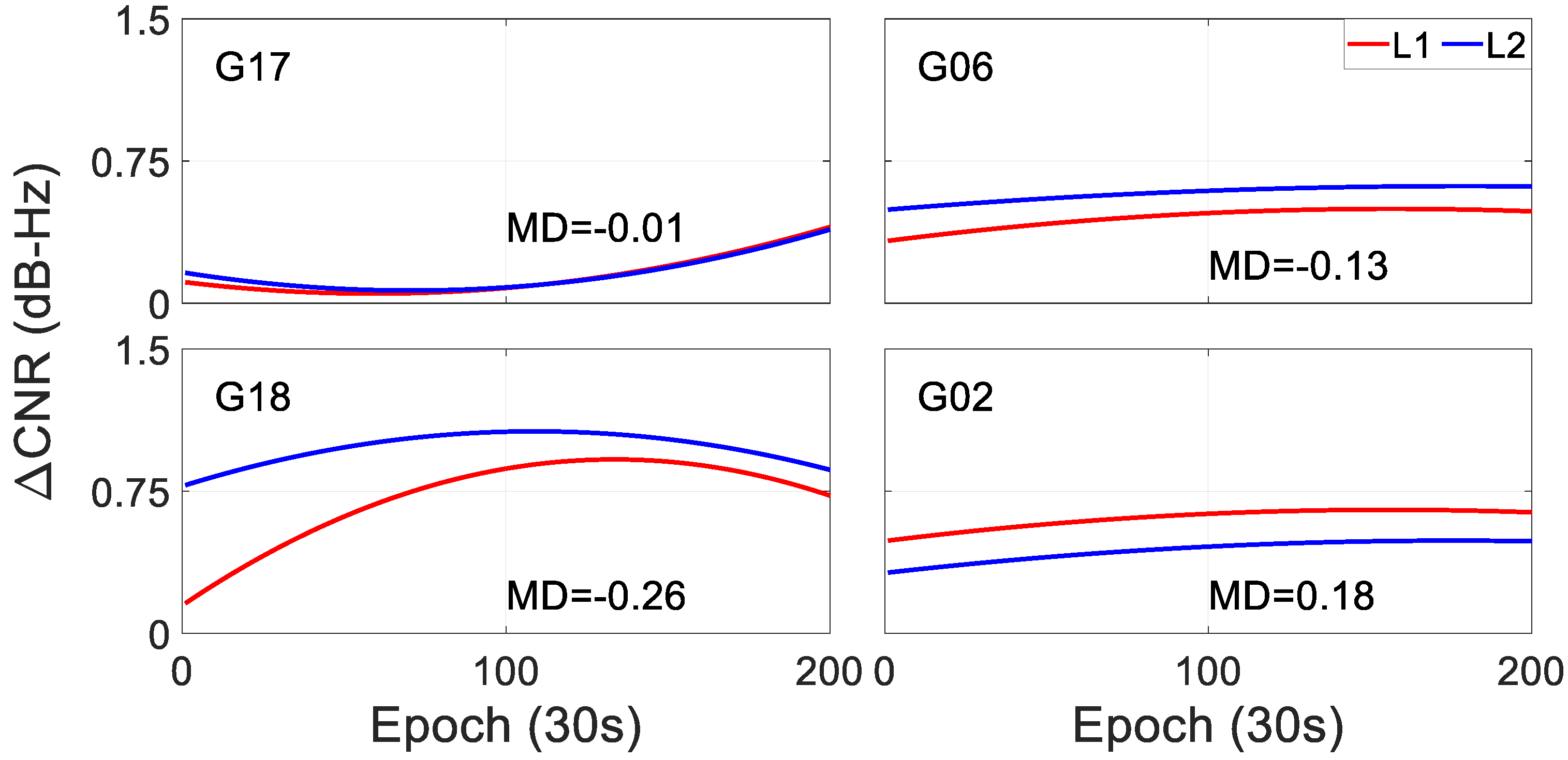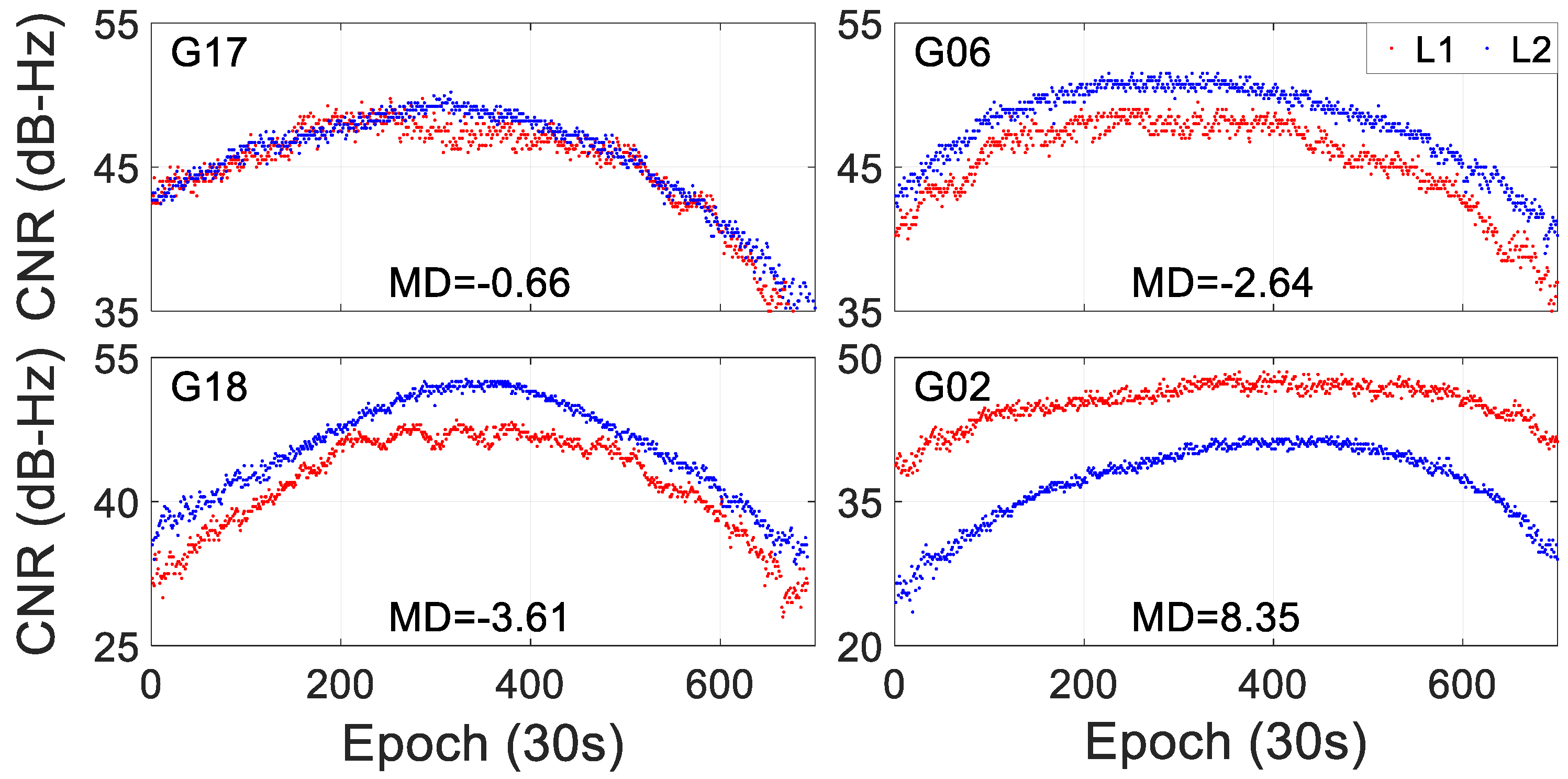 Figure 2. The red and blue dots denote the L1 and L2 frequencies, respectively. MD denotes the average difference between the CNRs of the L1 frequency and the L2 frequency.