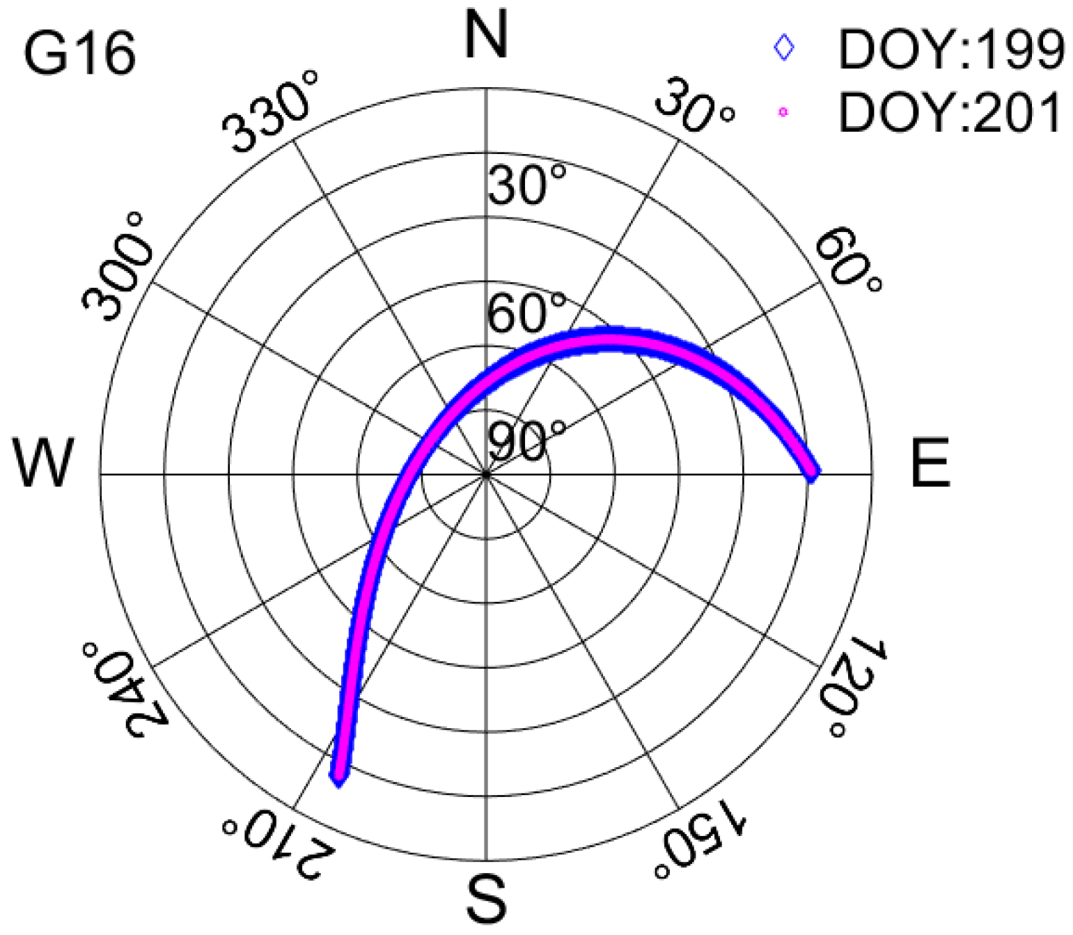 Figure 3 demonstrates that the ground track of the G16 satellite on DOY 199 remains the same as that on DOY 201. Thus, if the surrounding environment of the observation station does not change during the flood, the CNR values on these two days would be expected to be nearly the same.