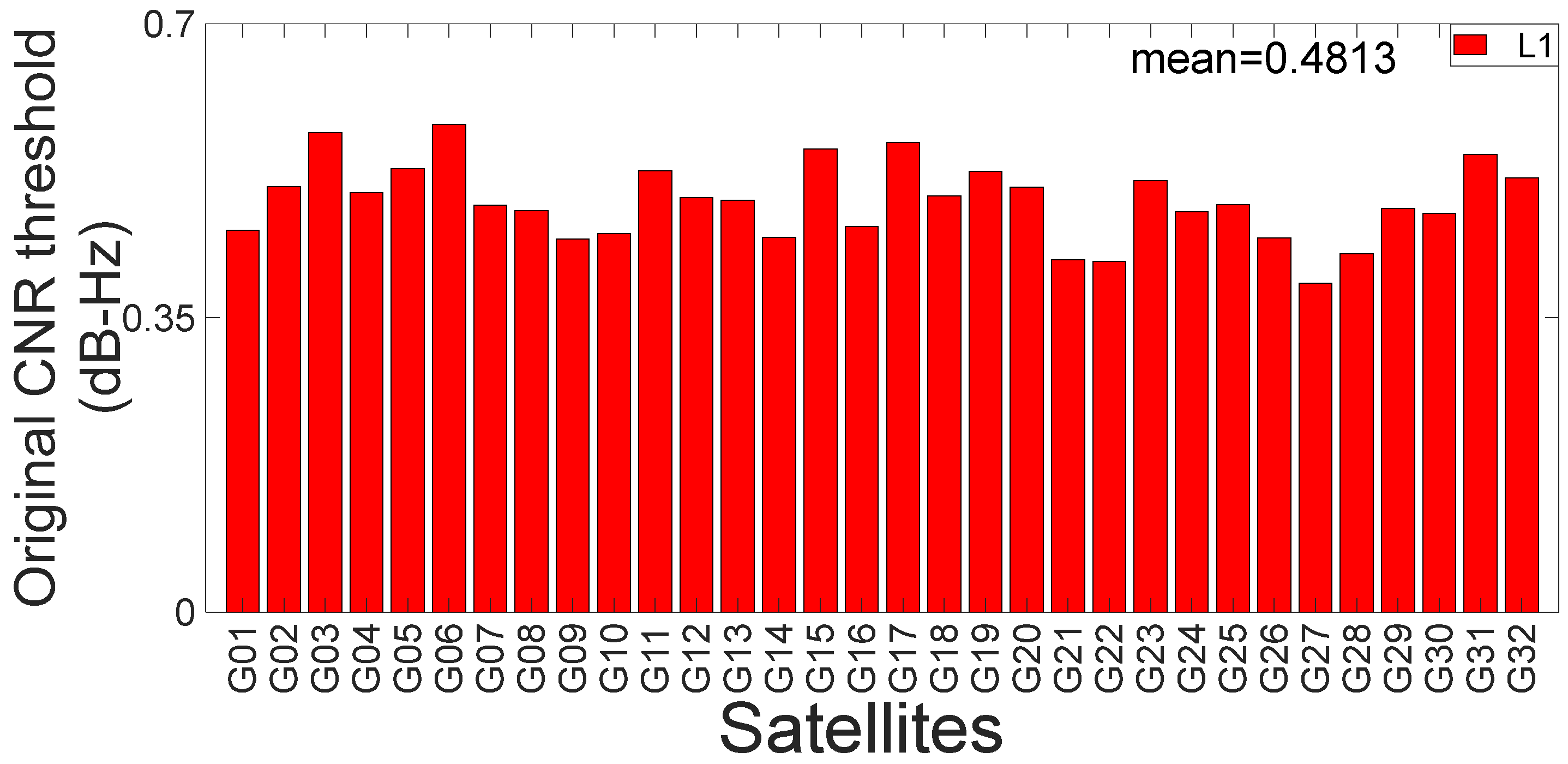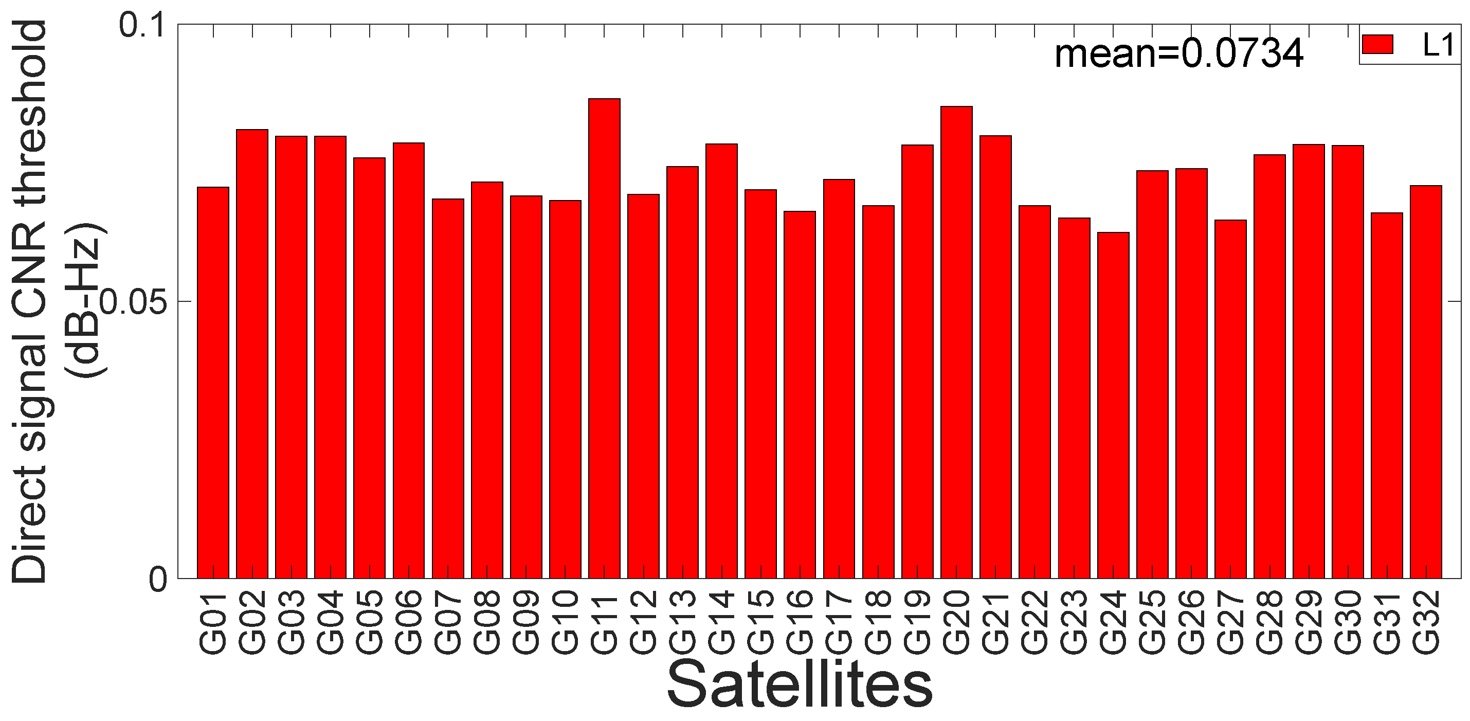 Figure 8, where the horizontal axis denotes different GPS satellites, and the vertical axis represents the threshold value in dB-Hz. It is evident that the threshold of the direct-signal CNR is significantly lower than that of the original CNR. The average threshold for the direct signal is approximately 0.07 dB-Hz, demonstrating improved accuracy compared with the 0.48 dB-Hz observed for the original CNR. Therefore, the above results indicate that mitigating the influence of non-direct signal components substantially enhances the accuracy of the threshold estimation. However, the threshold of the direct-signal CNR is still affected by random noise. In addition, it should be noted that the original CNR threshold model and direct signal threshold model, which are presented in