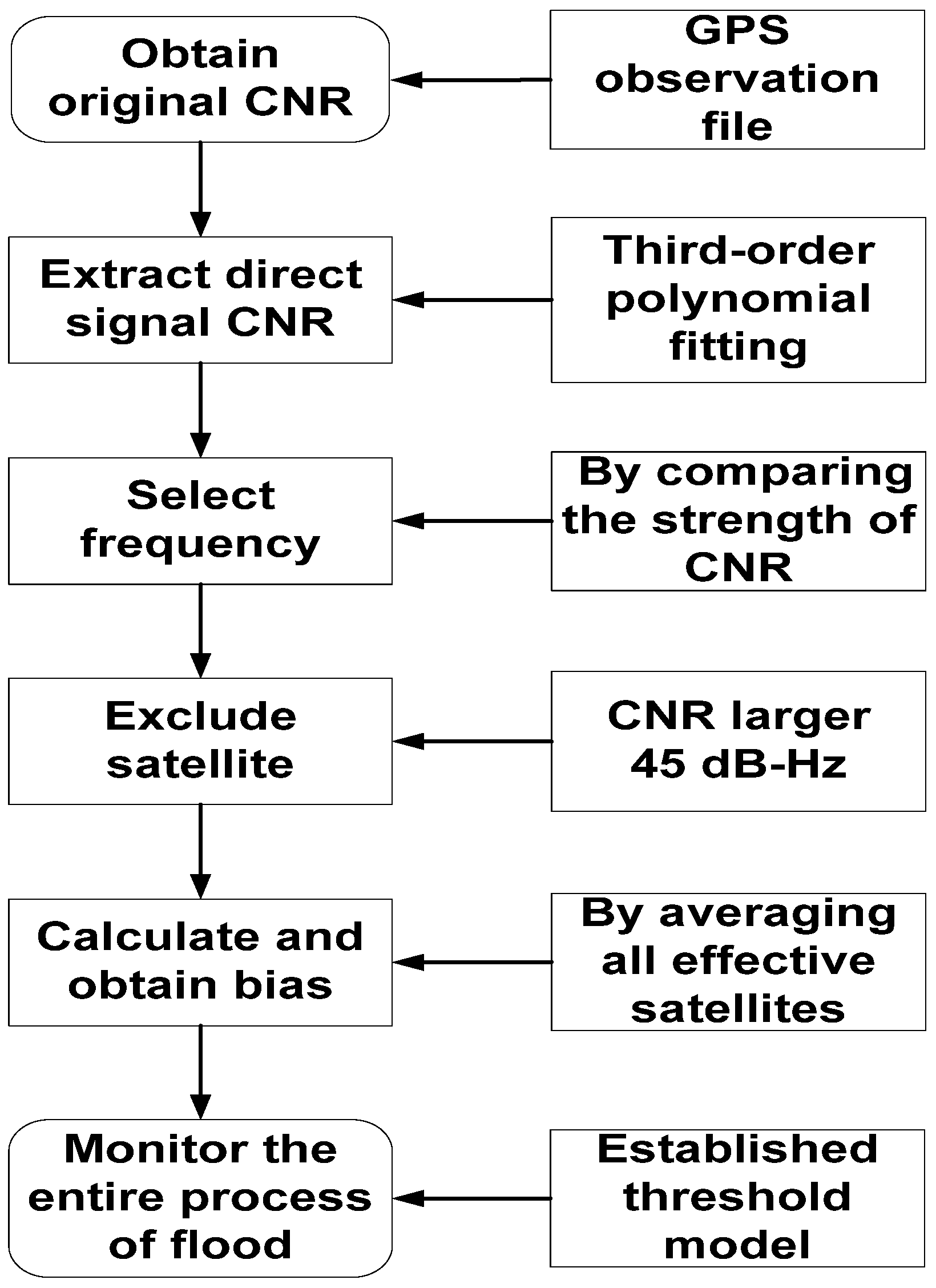 The proposed method can be summarized in the following steps: (1) Establish the threshold model by using data from globally distributed MGEX stations. (2) Obtain the original CNR from the observation file in RINEX format. (3) Extract the direct-signal CNR by using a third-order polynomial fitting model. (4) Select the frequency based on a comparison of the CNR strength between the L1 and L2 signals. (5) Exclude the satellite by comparing the strength of the CNR; only a CNR larger than 45 dB-Hz is used. (6) Calculate the difference in the CNR between the flood environment and without flood for all effective satellites, and then compare the difference to the established threshold model. Only the satellite whose bias is larger than the threshold is selected. (7) Obtain the final difference by averaging all effective satellites for each epoch. (8) Monitor the entire process of the flood by using the results of the final difference and the established threshold model.
