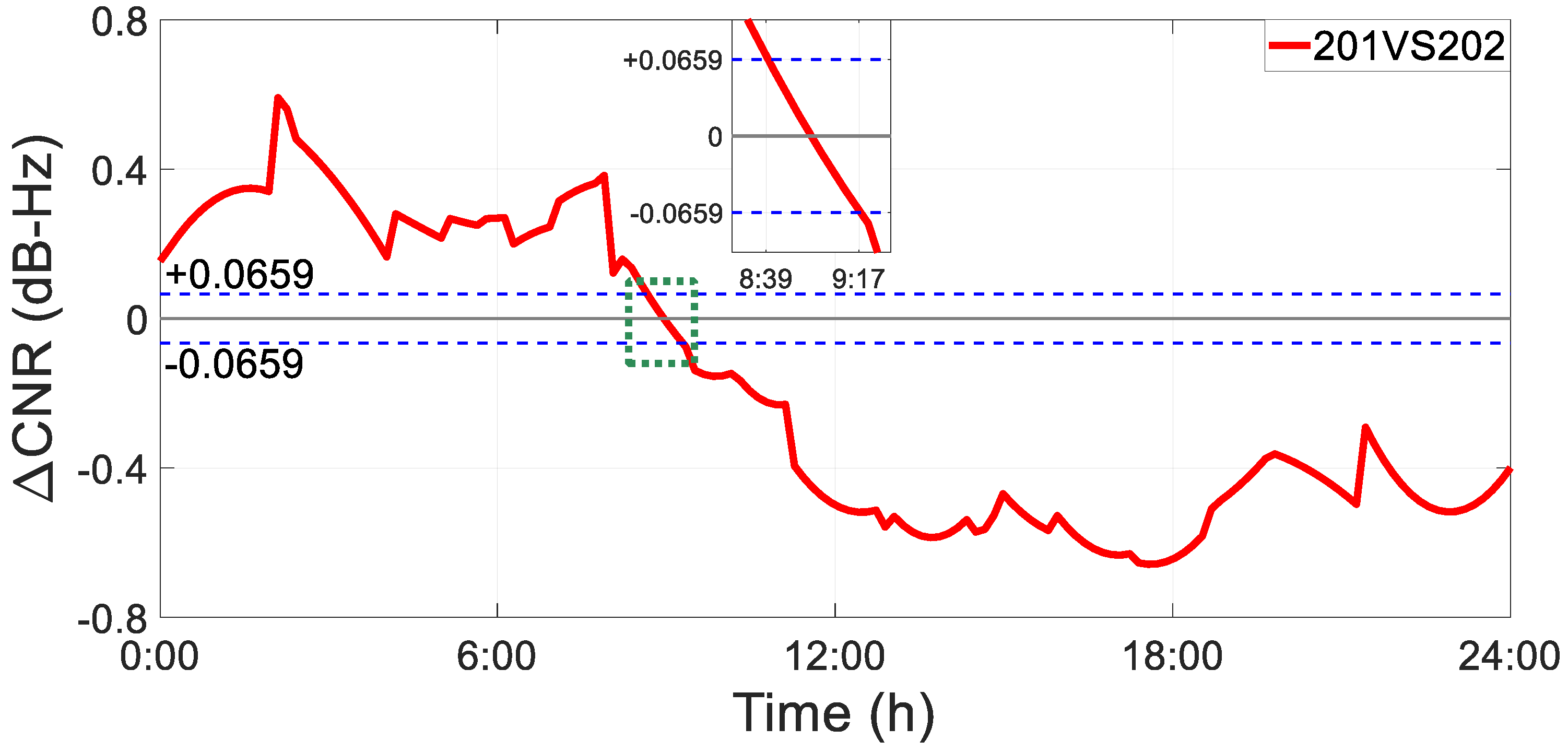Figure 15. By analyzing the entire trend of the results, it can be seen that there is a reversal at 8:39 AM on DOY 202. Before 8:39 am, the bias of the CNR between them is larger than zero and even larger than the threshold. The results indicate that the impact of flooding on the CNR for DOY 202 is greater than that observed on DOY 201, and also suggest that the flood conditions intensified on DOY 202 during this stage. Subsequently, the CNR bias drops below zero, implying that the floodwaters began to recede relative to DOY 201. This transition is highlighted within the green dashed box. However, whether this denotes that the flood waters had receded after 9:17 AM should be further analyzed by comparing the bias between DOY 202 and DOY 203, 2021.