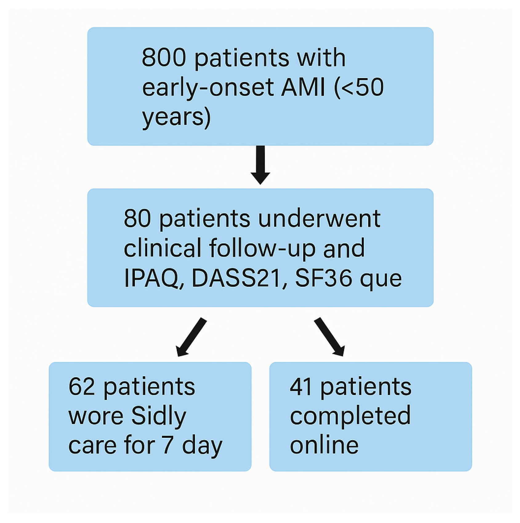 From the total eligible pool, 80 participants were randomly selected, following a stratified approach to balance sex distribution, index MI type, and treatment modality (PCI vs. conservative). Among these, 62 individuals were equipped with a Sidly Care Pro, Sidly, Poland wearable device, which enabled the continuous monitoring of physiological and behavioral parameters relevant to post-AMI recovery. A schematic representation of the recruitment process and allocation strategy is provided in