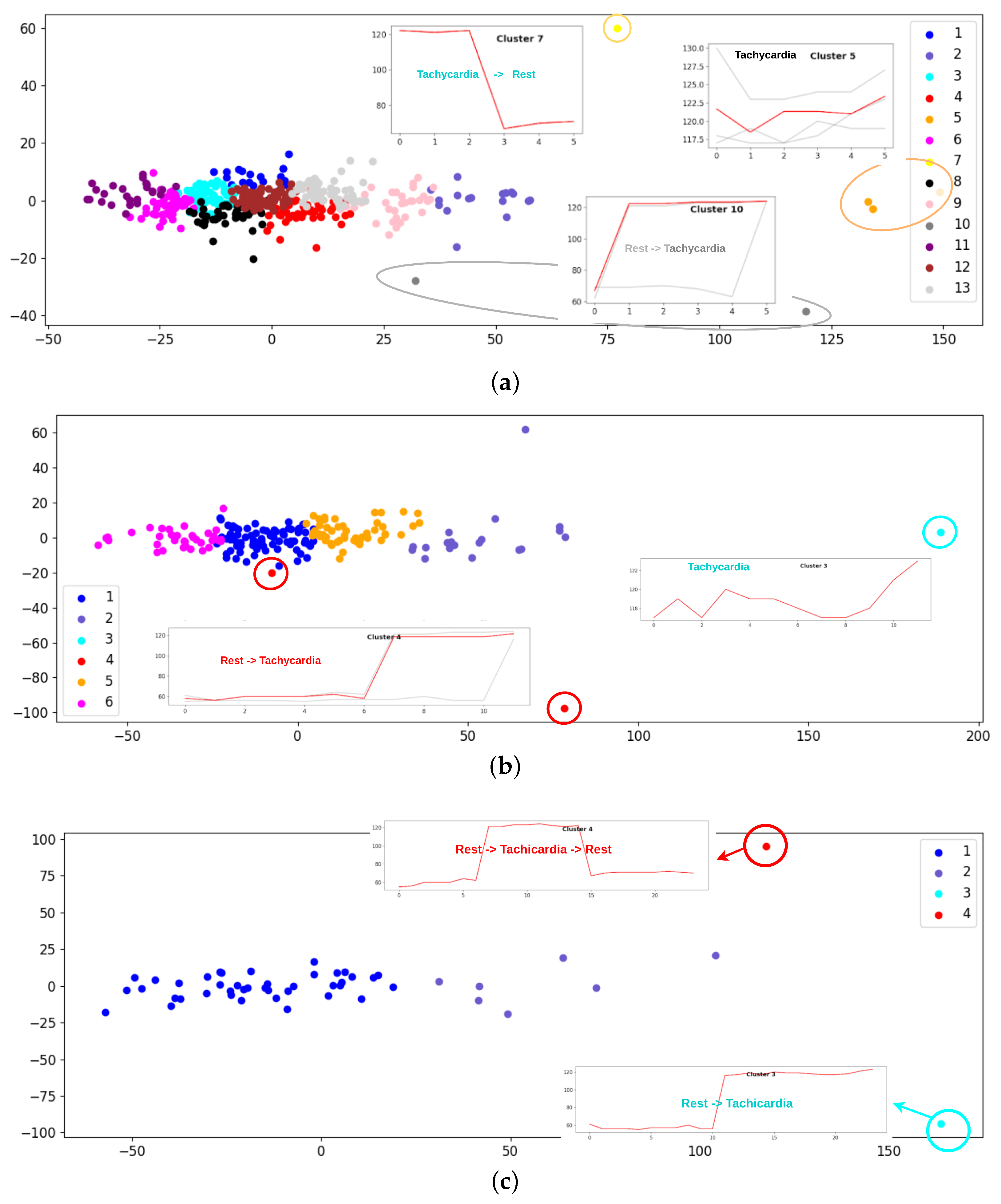 PCA projections facilitated a visualization of cluster separability and pattern structure. These analyses identified diverse dynamic profiles such as rest–tachycardia–rest and sustained tachycardia.