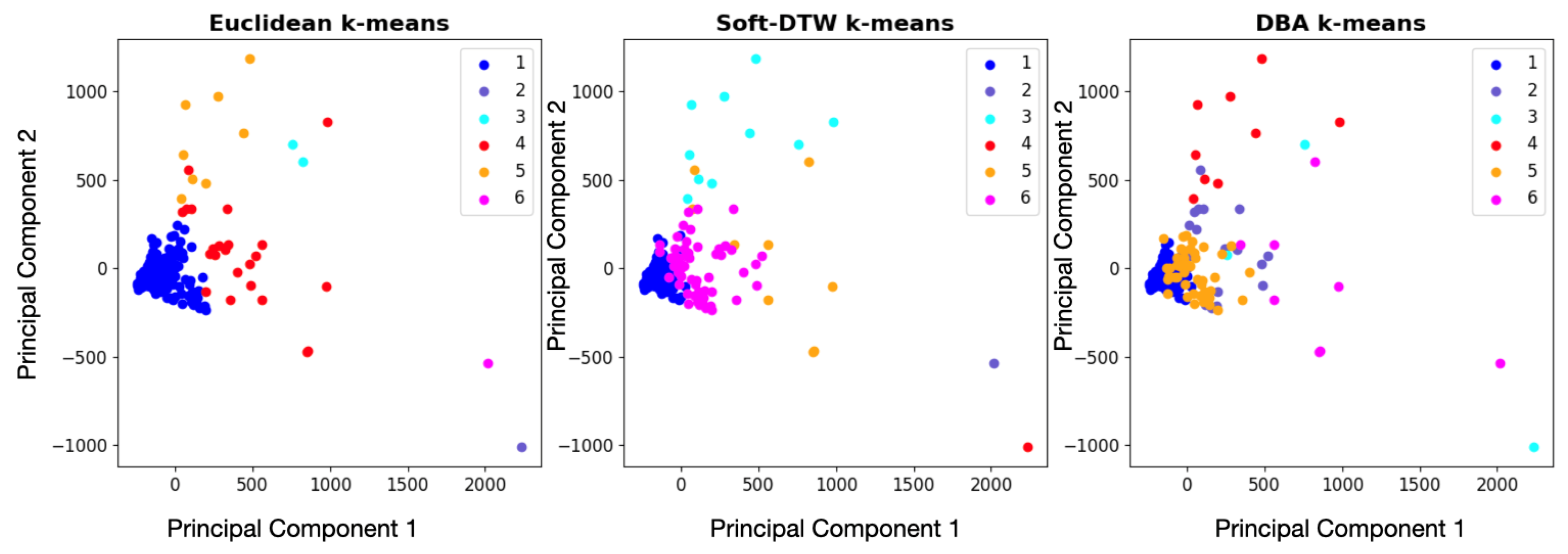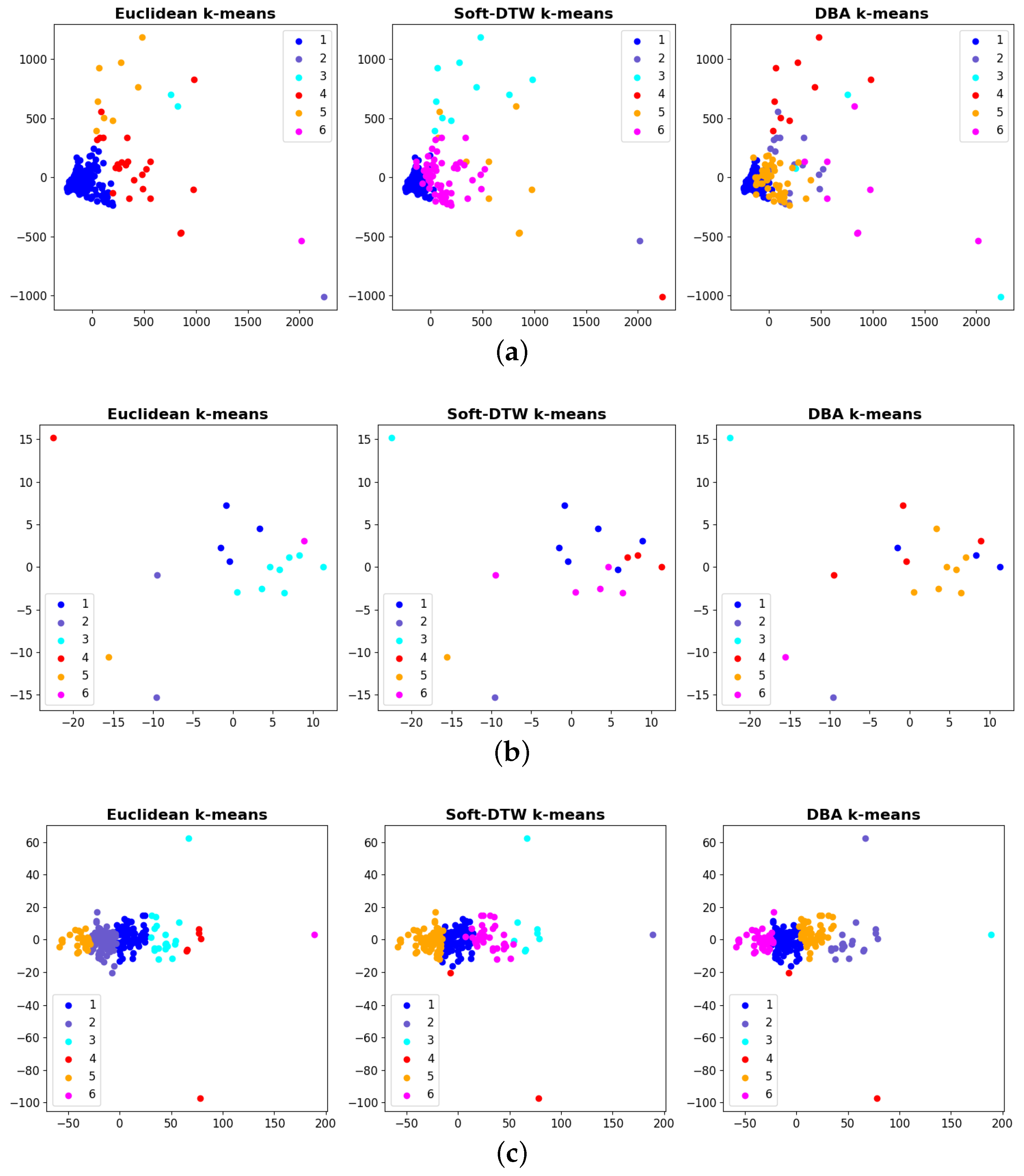 Figure 8 summarizes the clustering outcomes for each modality, highlighting characteristic groupings and temporal transitions reflected in step activity, oxygen saturation dynamics, and heart rate variability. For consistency across signals, medium-range windows were adopted, and the number of clusters was fixed at six. Within this setting, we systematically compared three variants of time-series k-means—Euclidean k-means, soft-DTW k-means, and DBA k-means—by varying the underlying distance metric while holding all other parameters constant. This design allowed us to evaluate the impact of shape-based versus alignment-aware similarity measures on clustering performance in physiological time series.