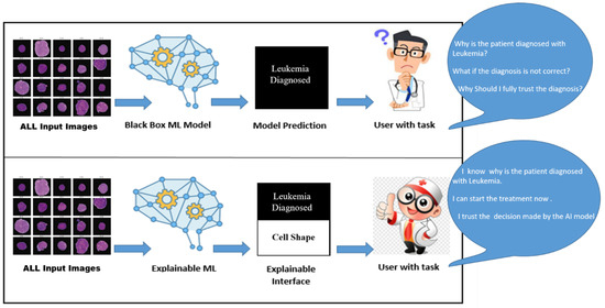 Figure 1 shows a comparative analysis of an AI-based ALL diagnostic with/without XAI. In the upper half, the AI black-box model takes input data (ALL microscopic images) and, after complex, unknown processing, produces results in ALL predictions. This result might be accurate but is vague and unclear to end users. In this case, the end user could be experts in the medical domain (oncologists, medical specialists, histopathologists), patients, pharmaceutical manufacturers, or the scientific community. They may have unanswered questions about the AI model’s trustworthiness, including verification, fairness, debugging, and model monitoring. The most important aspect is the fairness and the removal of bias in the AI model’s decisions. However, the lower half of Figure 1 shows an XAI-based model for ALL with transparent and understandable diagnosis predictions/recommendations. The XAI will help generate explanations for end users and stakeholders to answer questions like ’Why was this prediction made? Why don’t you diagnose the disease? How can we improve the results? What are the reasons for success/failure?’ and so on. This kind of understanding consequently leads to gaining trust in the model’s fairness and transparency.