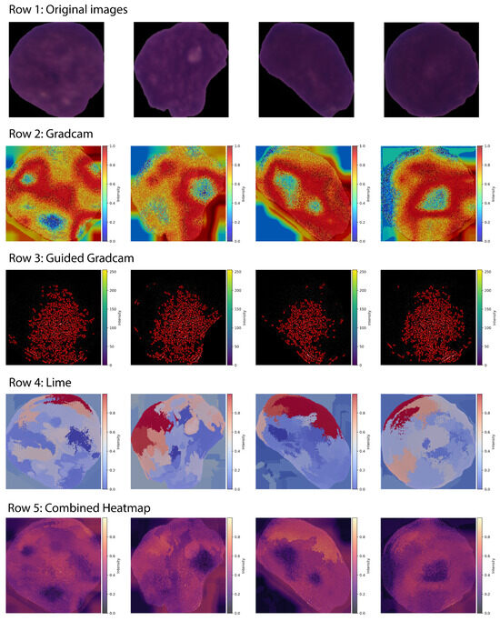 Furthermore, all of the hybrid heatmap approaches that we propose offer more precise visual explanations than using any of these methods individually, and this aspect of combined interpretability has not been fully explored in the context of leukemia detection. This addresses a key challenge in interpreting AI-based medical image analysis: the trade-off between local fidelity and high-level feature relevance, offered by individual XAI methods. In the proposed model, for a given leukemic cell image, hybrid heatmaps fuse the strengths of individual XAI methods, such as LIME’s local fidelity and Grad-CAM’s coarse localization, and provide fine-grained pixel-level details via Guided Grad-CAM.