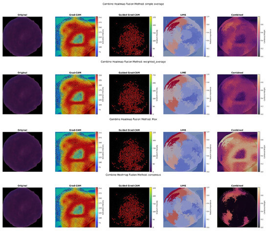 Each visual explanation generated by a particular XAI method is assigned a weight, and all pixels in the heatmaps are averaged to create the final map. In this approach, each explanation method in the combined visualization is treated equally.