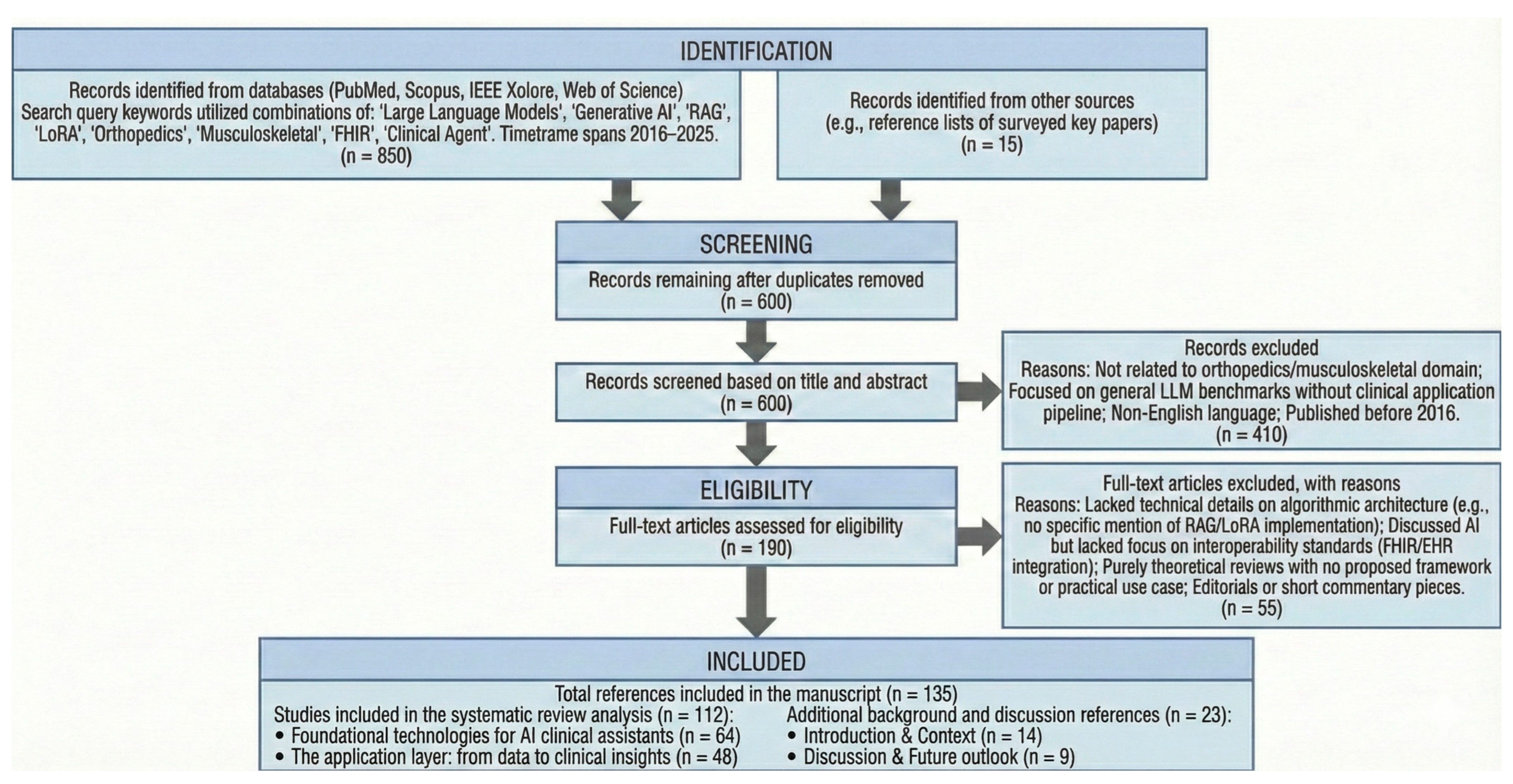 Figure 3 depicts the retrieval-augmented generation (RAG) pipeline for orthopedic clinical question answering. It synthesizes well-documented retrieval strategies from recent clinical AI implementations while emphasizing specific architectural innovations that address the clinical precision bottleneck. While RAG itself is an established technique in the literature [