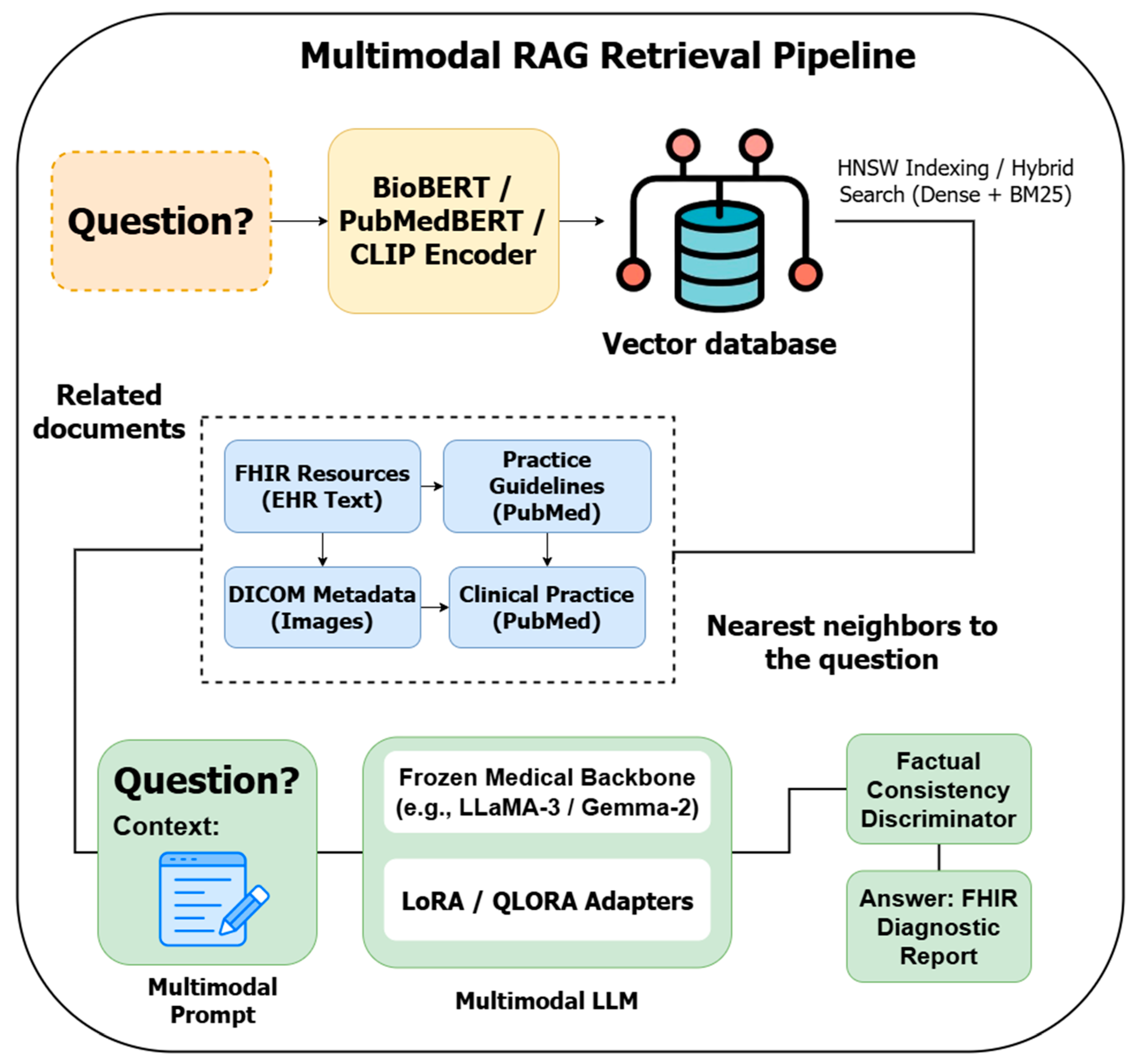 26] indexing to scale retrieval to million-scale vector databases while maintaining logarithmic time complexity, which is crucial for real-time clinical decision support. (3) The end-to-end tracking of factual grounding from curated authoritative knowledge sources through multimodal encoding to final model inference.