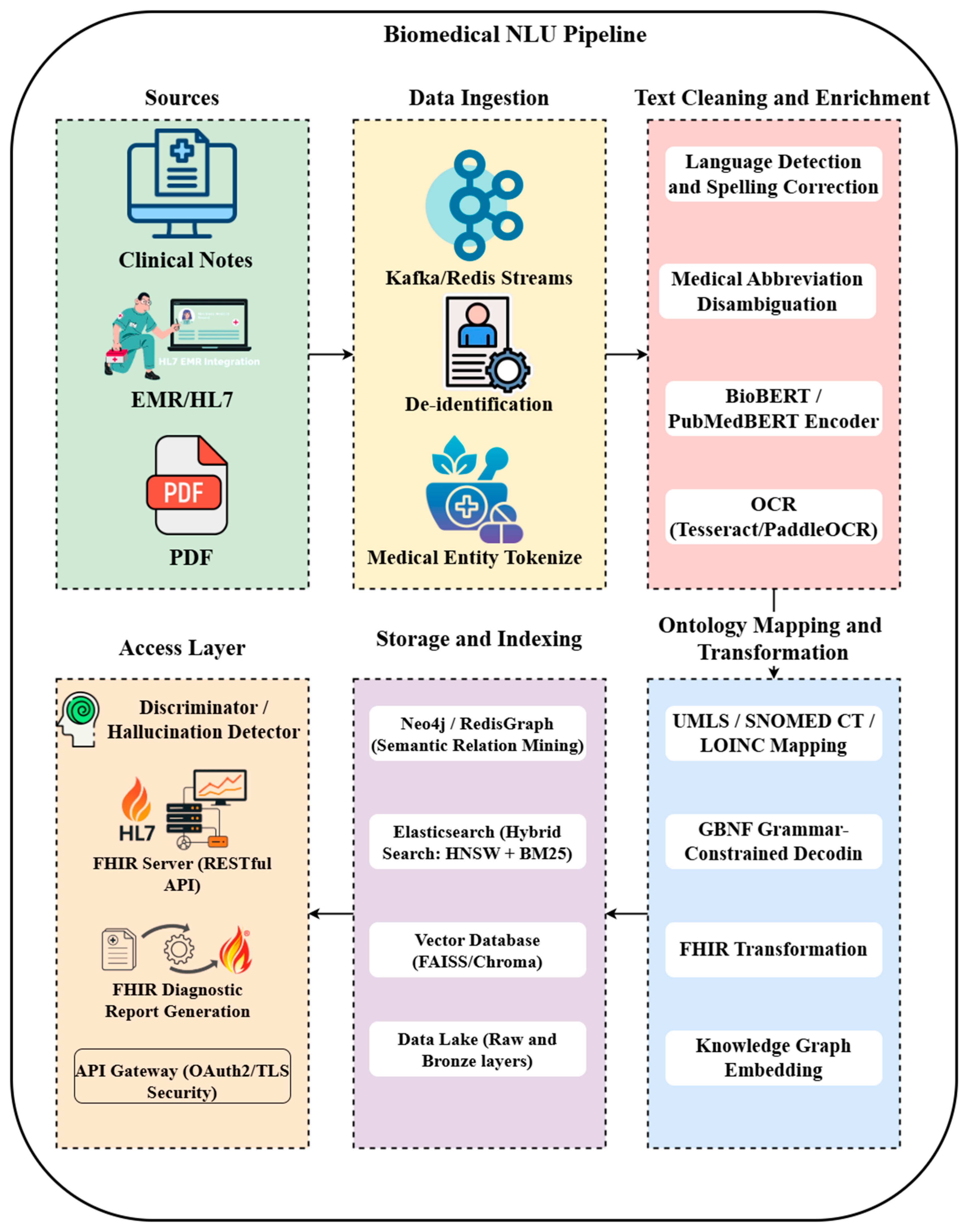 Figure 4, which is designed to support low-latency processing in high-throughput clinical environments. As depicted, the pipeline ingests clinical notes, HL7-formatted message streams, and PDF documents via streaming services such as Kafka for immediate de-identification and section segmentation. Following preprocessing, an ontology mapping module aligns text spans with standardized medical terminology from sources such as UMLS, SNOMED, or LOINC to ensure semantic consistency. The resulting structured outputs are stored in a multi-model persistence layer. However, maintaining consistency across these disparate systems, Graph Databases (Neo4j) for relationships, Vector Stores (FAISS) for semantic search, and Document Stores for logs, presents a significant data engineering challenge. The choice of Hierarchical Navigable Small World (HNSW) indexing is theoretically grounded in its ability to maintain O(logN) search complexity even as the orthopedic dataset scales to millions of clinical records [