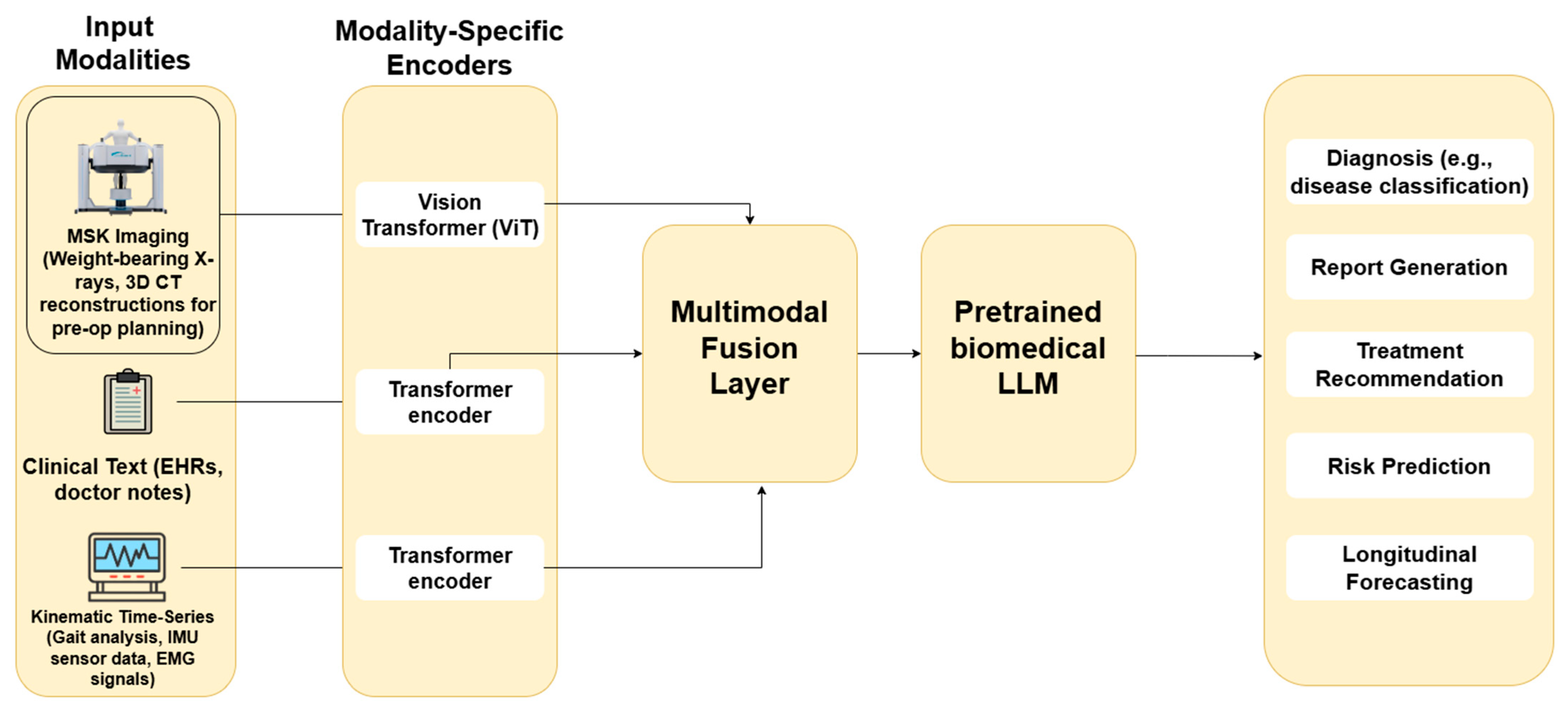 Figure 5 illustrates the integration of diverse input modalities, including MSK imaging (weight-bearing X-rays, 3D CT reconstructions), clinical text (EHRs, notes), and kinematic time-series data (gait analysis, IMU sensors) processed through modality-specific encoders (Vision Transformer, Transformer encoder). These inputs are synthesized in a Multimodal Fusion Layer and processed by a pretrained biomedical LLM to generate actionable outputs such as diagnosis, report generation, treatment recommendations, risk prediction, and longitudinal forecasting. This architectural arrangement will allow a pretrained biomedical LLM to generate actionable outputs ranging from automated 3D reconstruction to longitudinal recovery forecasting, effectively solving spatial surgical problems before operative intervention.